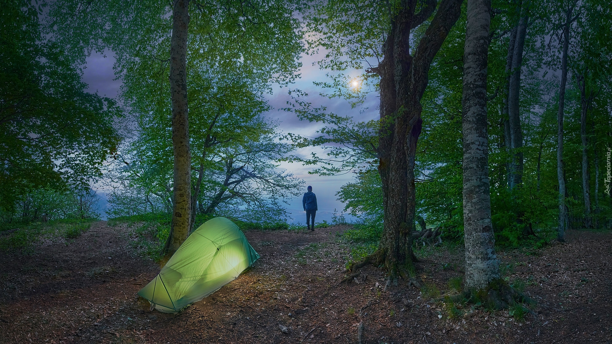 Edytor tapety: Człowiek obok namiotu pomiędzy drzewami