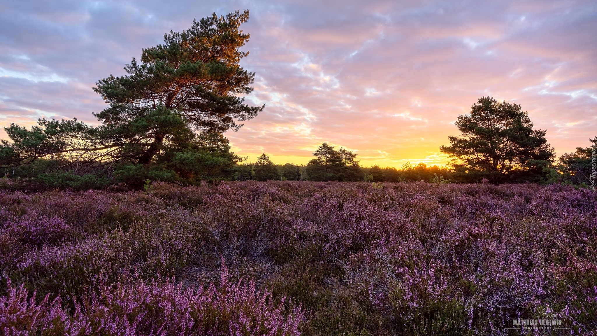 Edytor tapety: Wrzosowisko i drzewa o zachodzie słońca