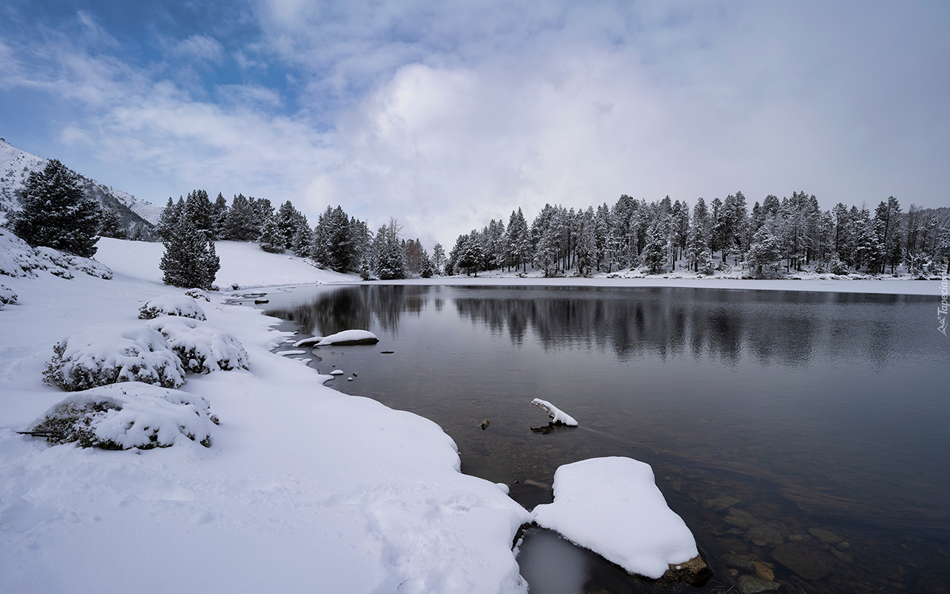 Edytor tapety: Zasypane śniegiem krzewy i ośnieżone drzewa nad jeziorem