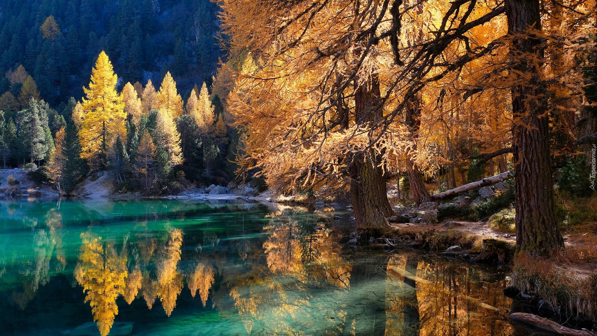 Edytor tapety: Rozświetlone drzewa w lesie nad jeziorem