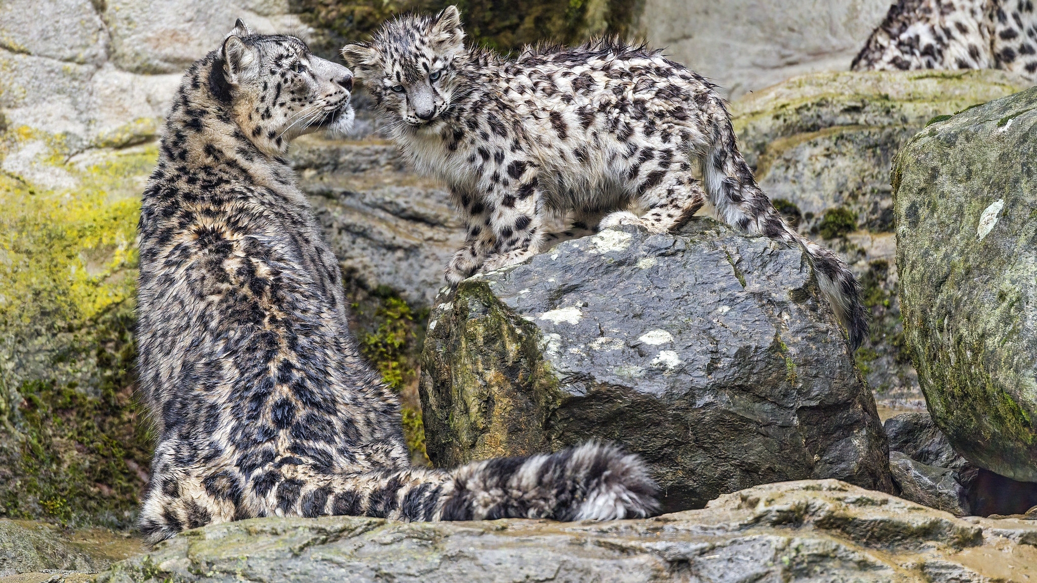 Edytor tapety: Młody irbis śnieżny obok matki na skale