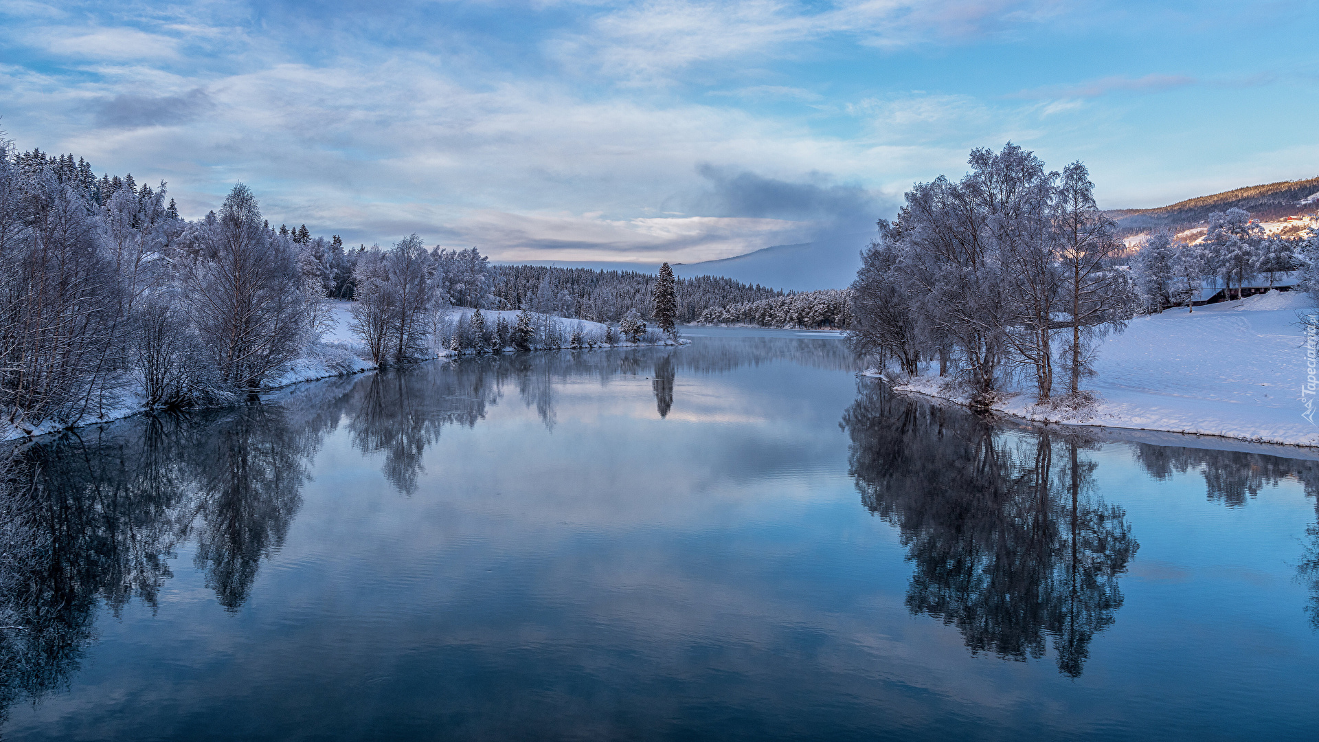 Edytor tapety: Drzewa po obu stronach rzeki zimową porą