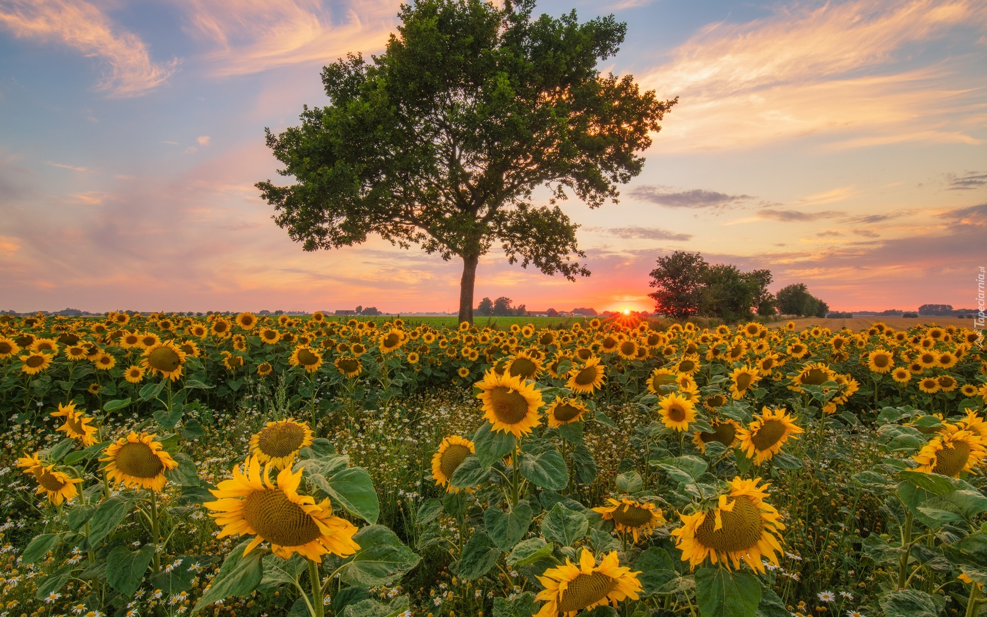 Edytor tapety: Drzewo i kwitnące słoneczniki na polu
