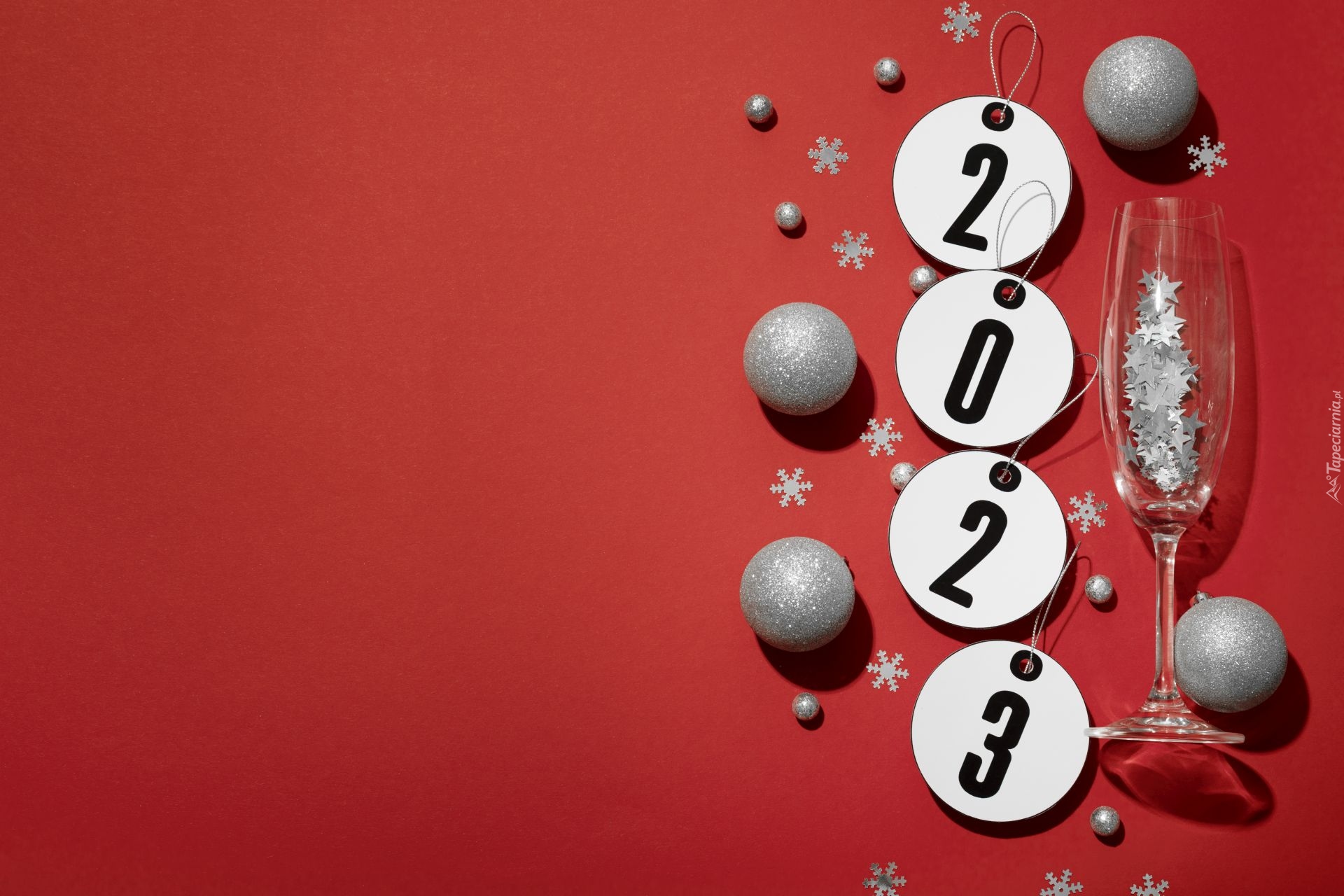 Edytor tapety: Kieliszek i bombki obok daty 2023