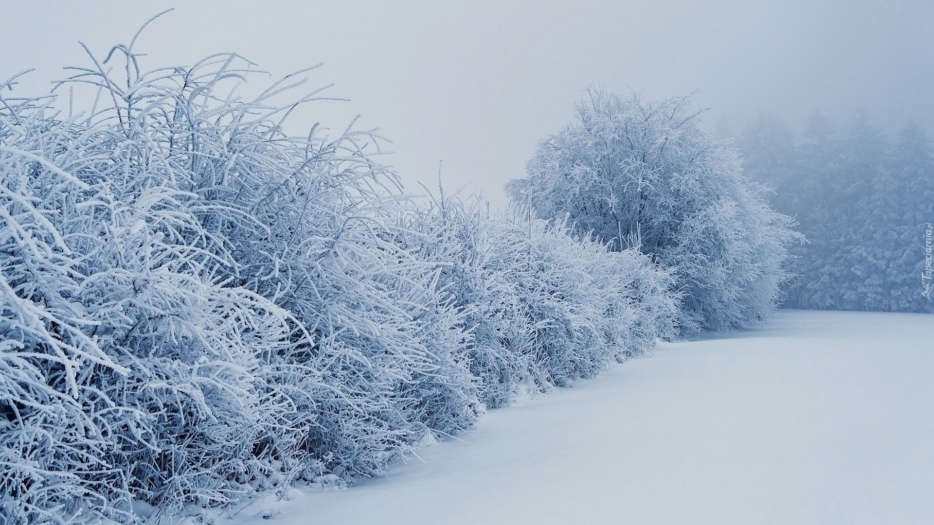 Edytor tapety: Oszronione krzewy i drzewa we mgle