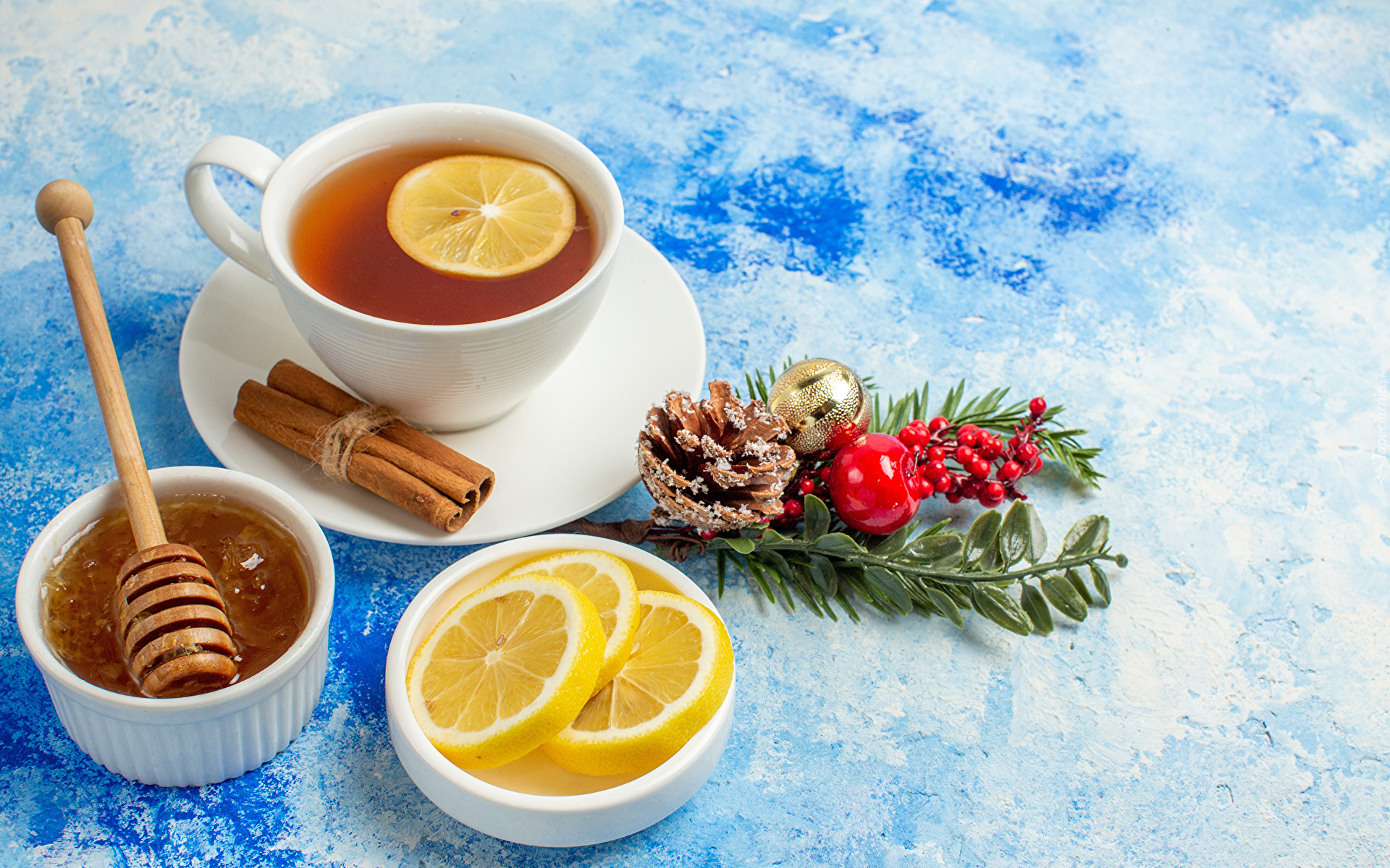 Edytor tapety: Filiżanka herbaty obok plasterków cytryny i miseczki miodu