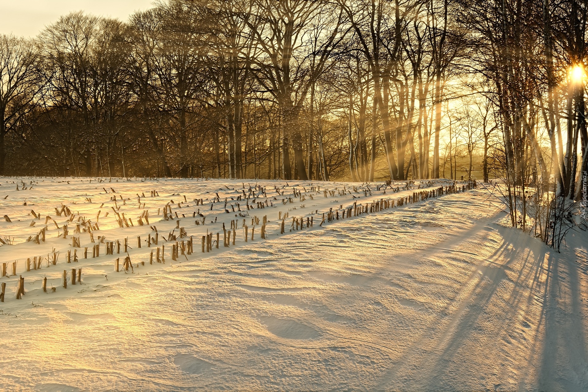 Edytor tapety: Drzewa i zasypane śniegiem pole w promieniach słońca