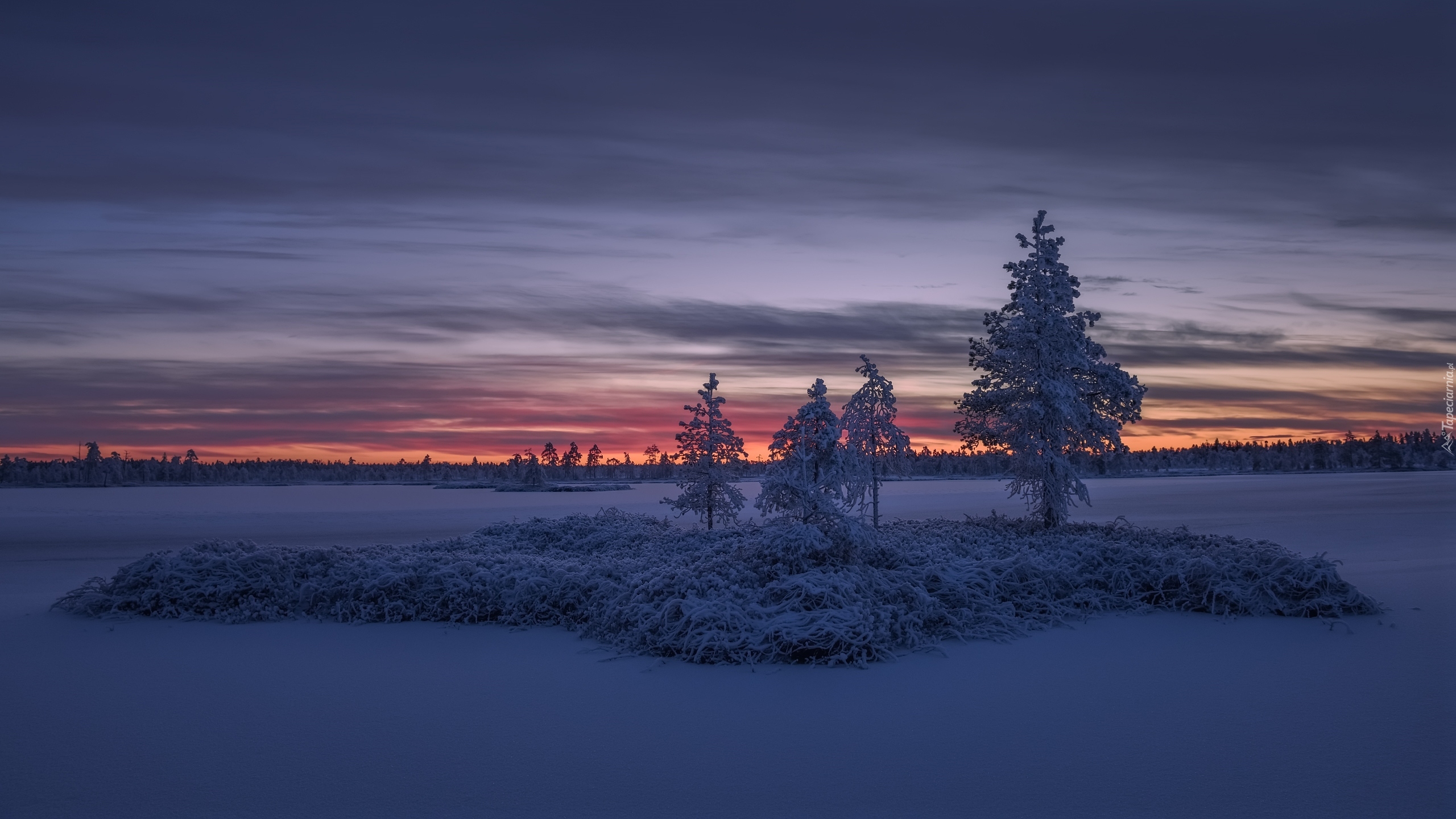 Edytor tapety: Oszronione drzewa i trawy o zmierzchu