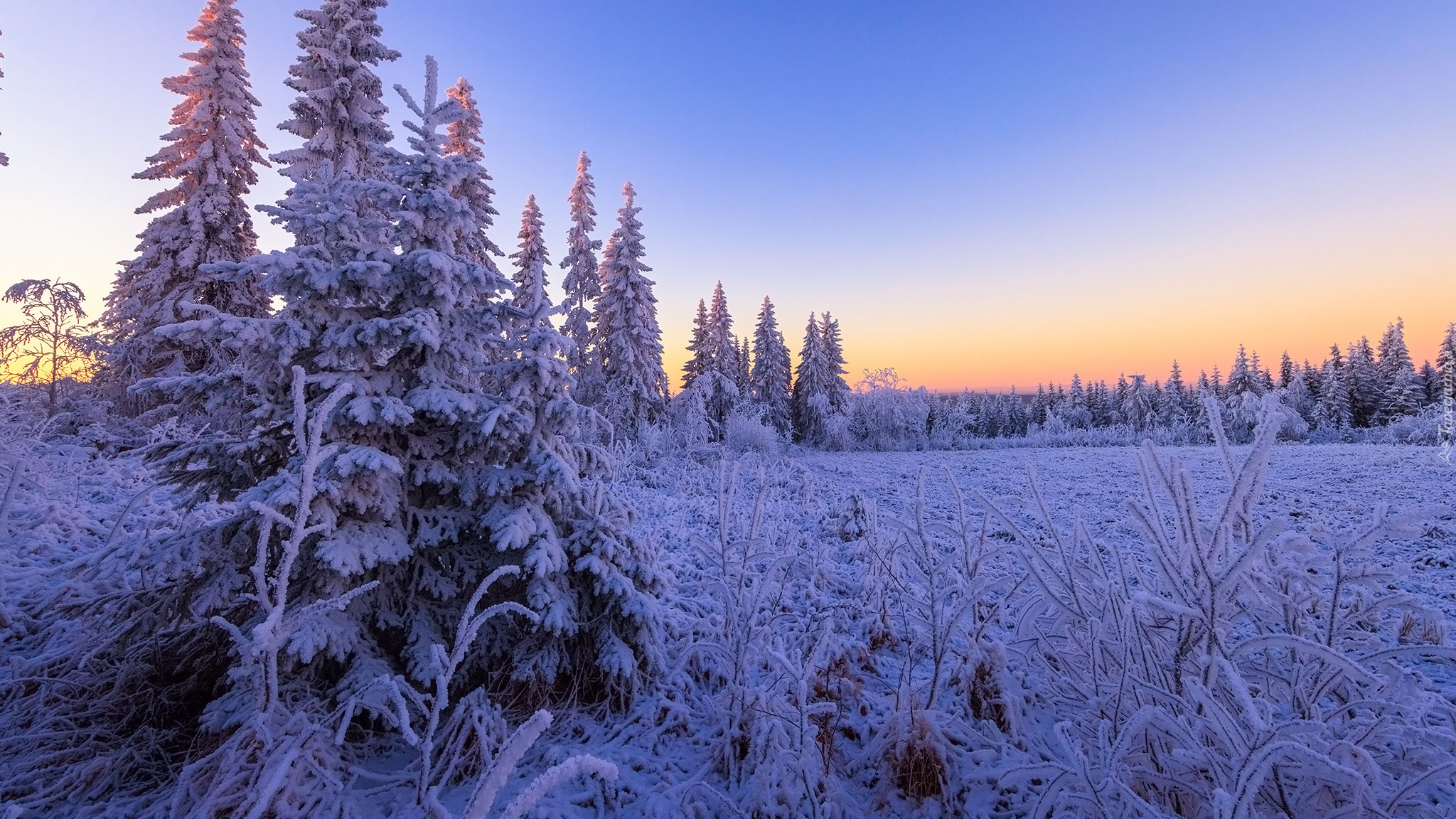 Edytor tapety: Szron na drzewach i roślinach w zachodzącym słońcu