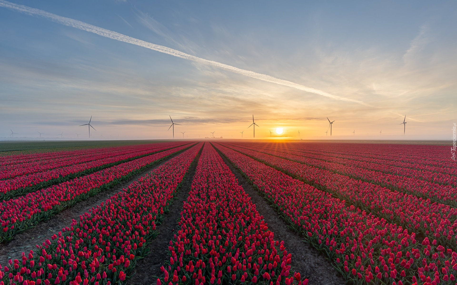 Edytor tapety: Plantacja tulipanów i wiatraki w oddali