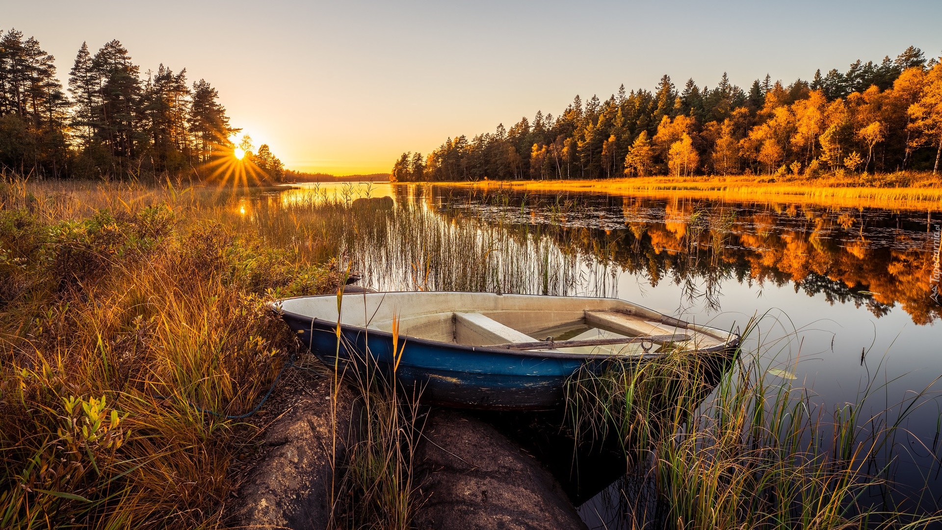 Edytor tapety: Łódka na brzegu jeziora o poranku