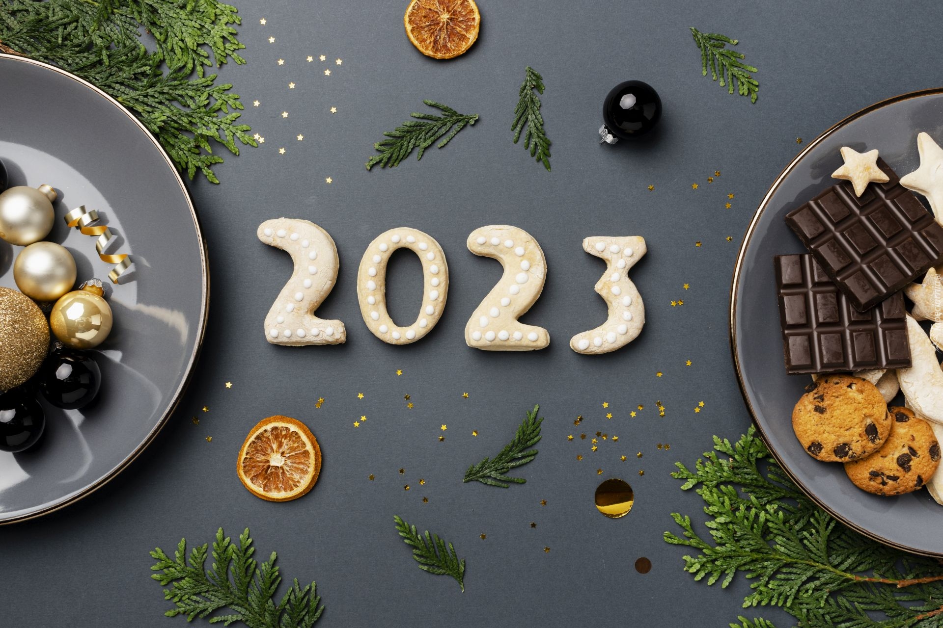 Edytor tapety: Data 2023 pomiędzy talerzami z bombkami i ciasteczkami