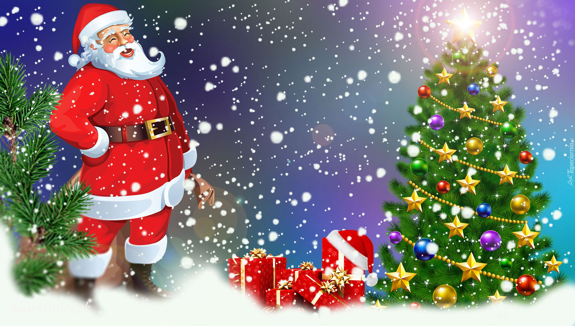 Edytor tapety: Mikołaj obok prezentów pod choinką