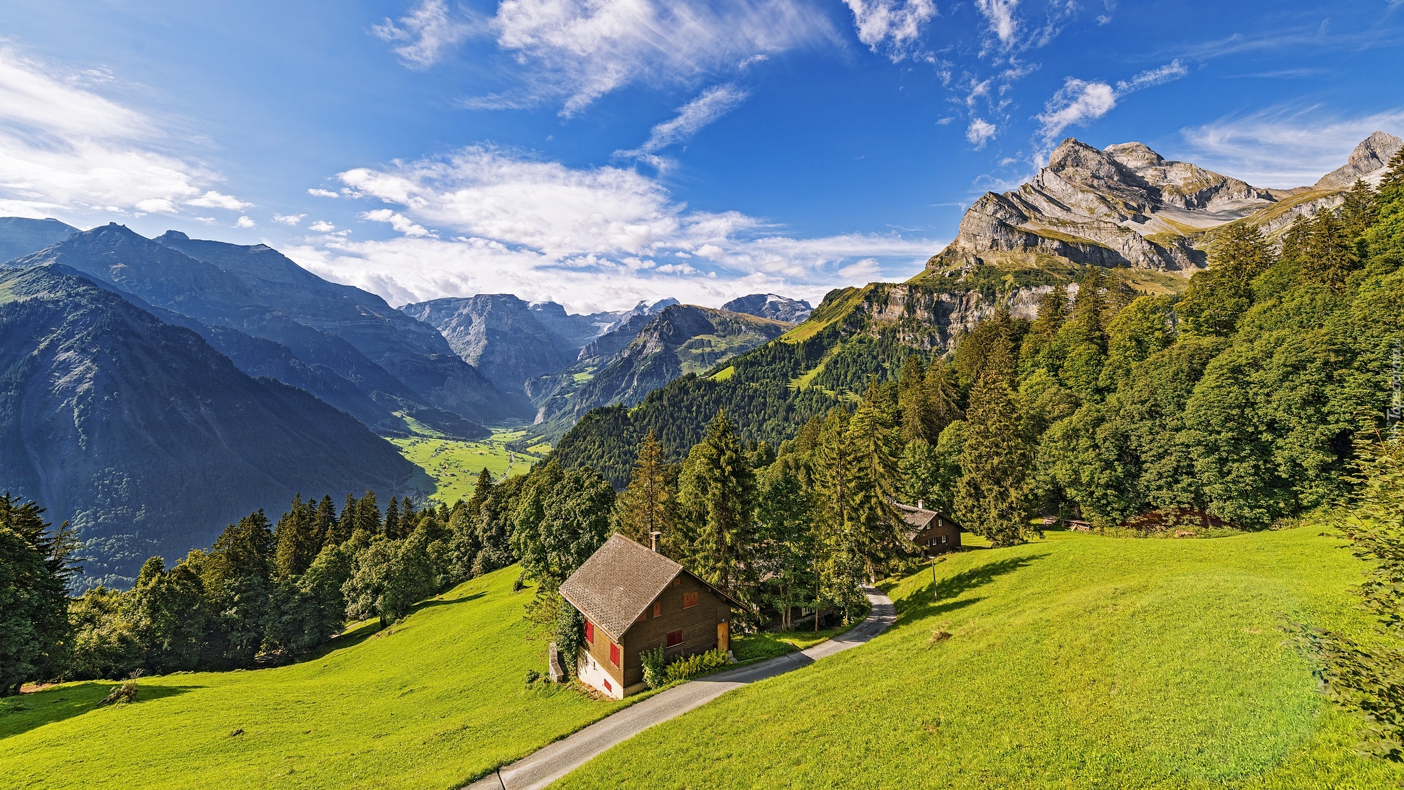 Edytor tapety: Domki przy drodze na tle Alp Glarneńskich