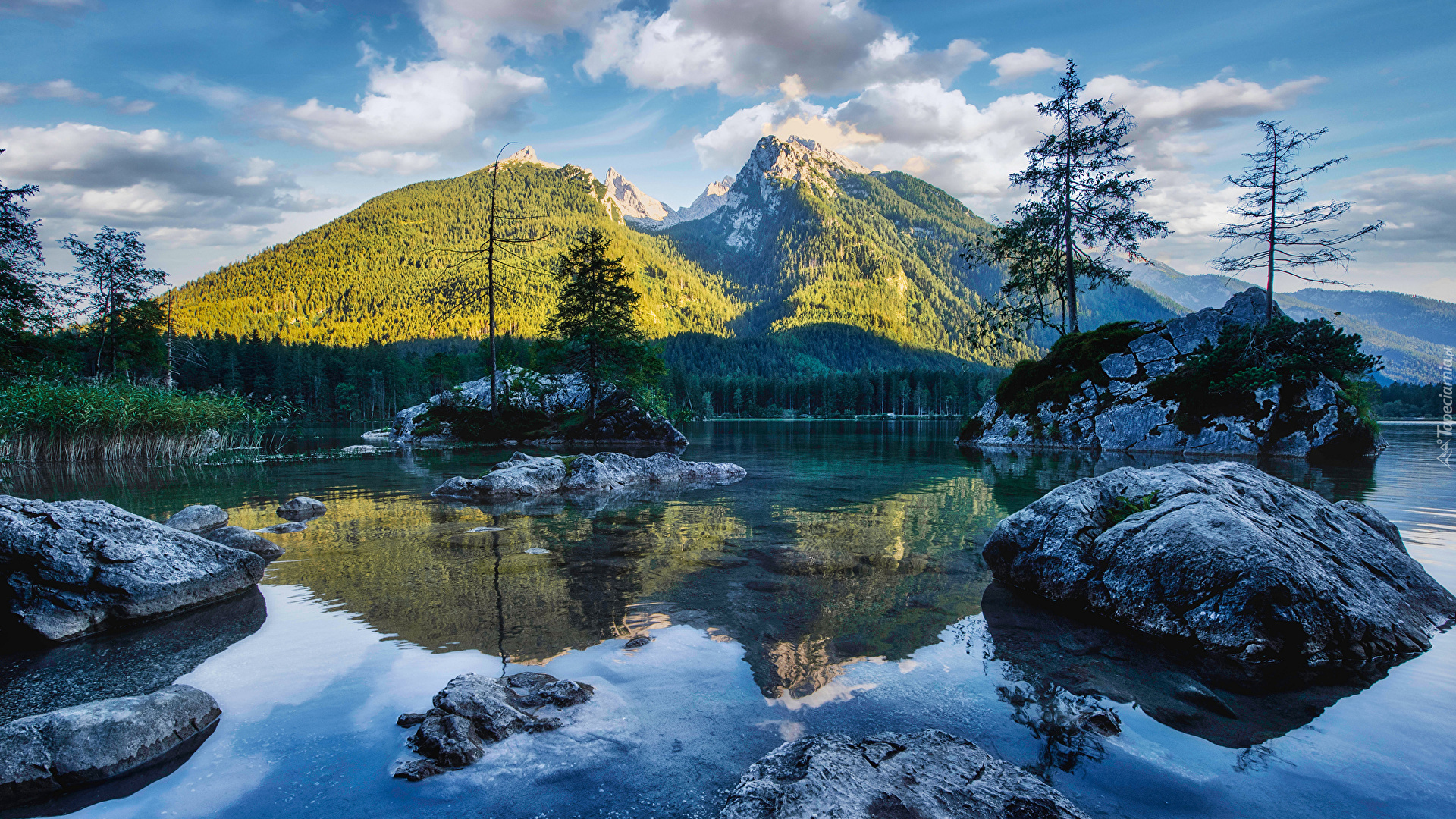 Edytor tapety: Drzewa na skałach w górskim jeziorze Hintersee