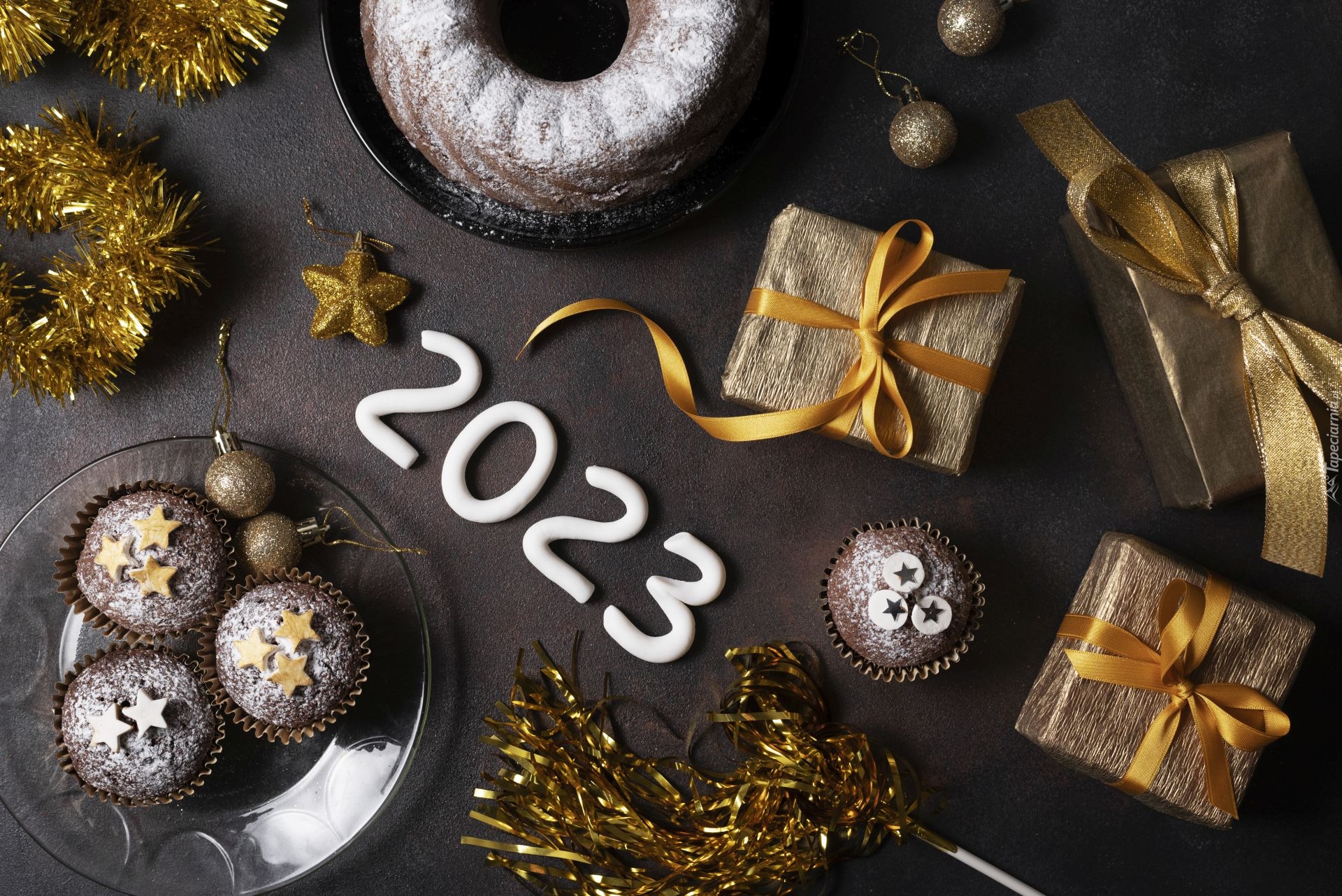 Edytor tapety: Prezenty i babeczki obok daty 2023