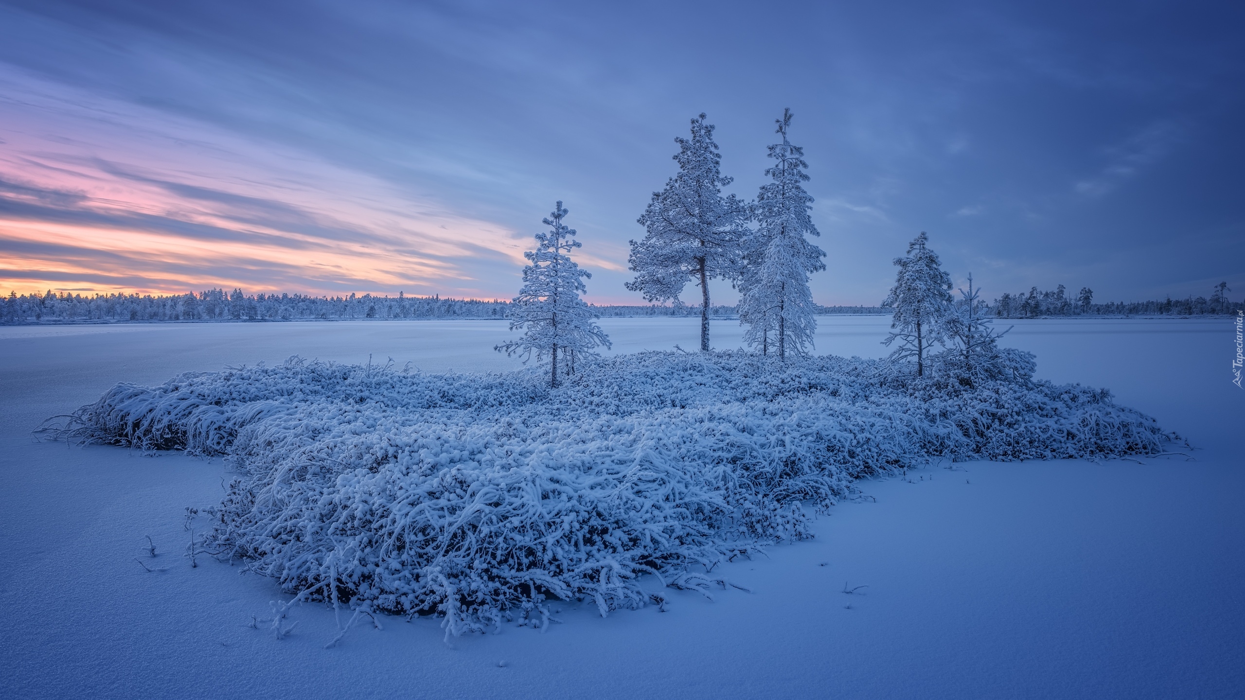 Edytor tapety: Ośnieżone drzewa i trawy na zamarzniętym jeziorze