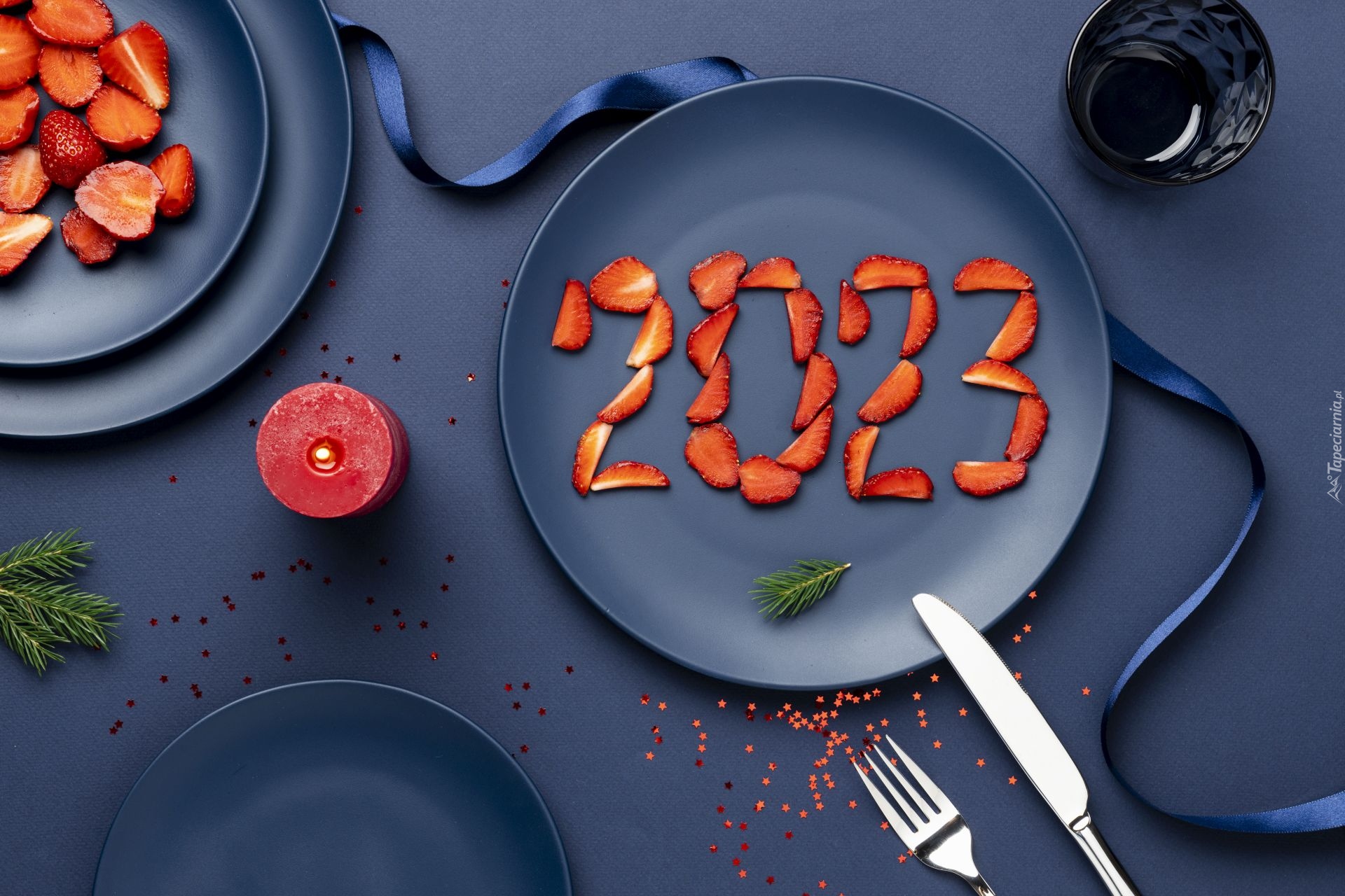 Edytor tapety: Data 2023 z pokrojonych truskawek na talerzyku