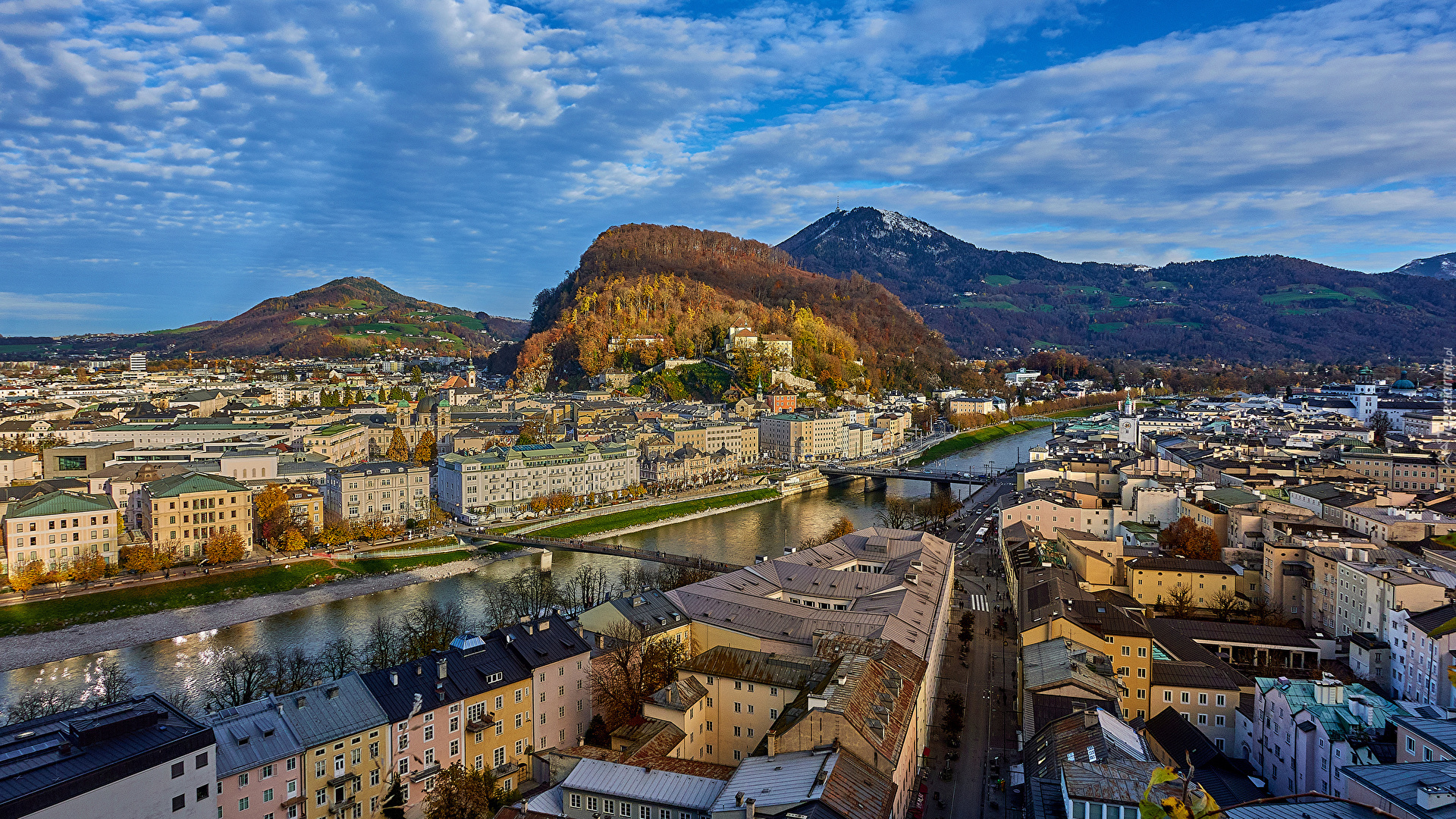 Edytor tapety: Widok na domy i rzekę Salzach w Salzburgu