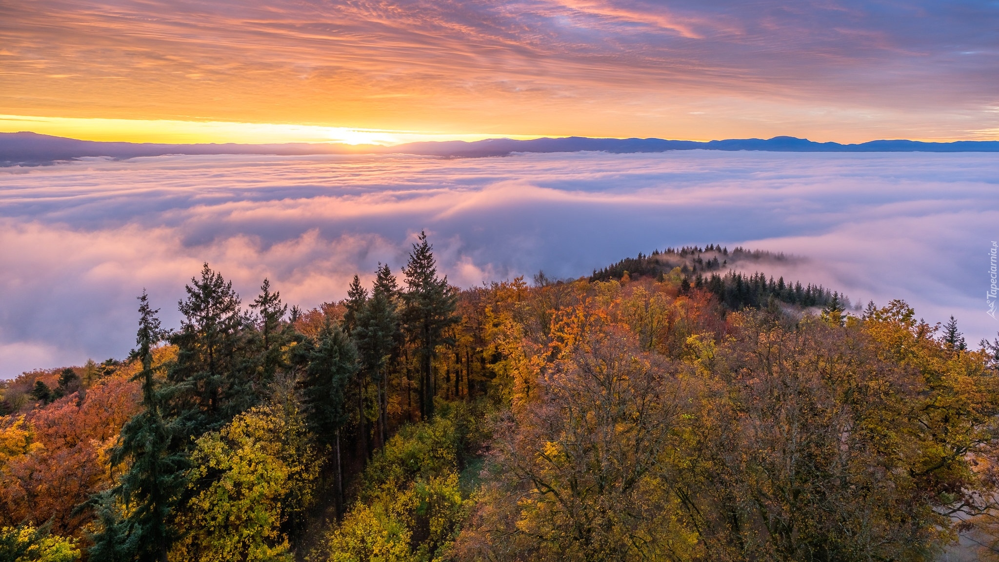 Edytor tapety: Jesienne drzewa i krzewy na tle gęstej mgły