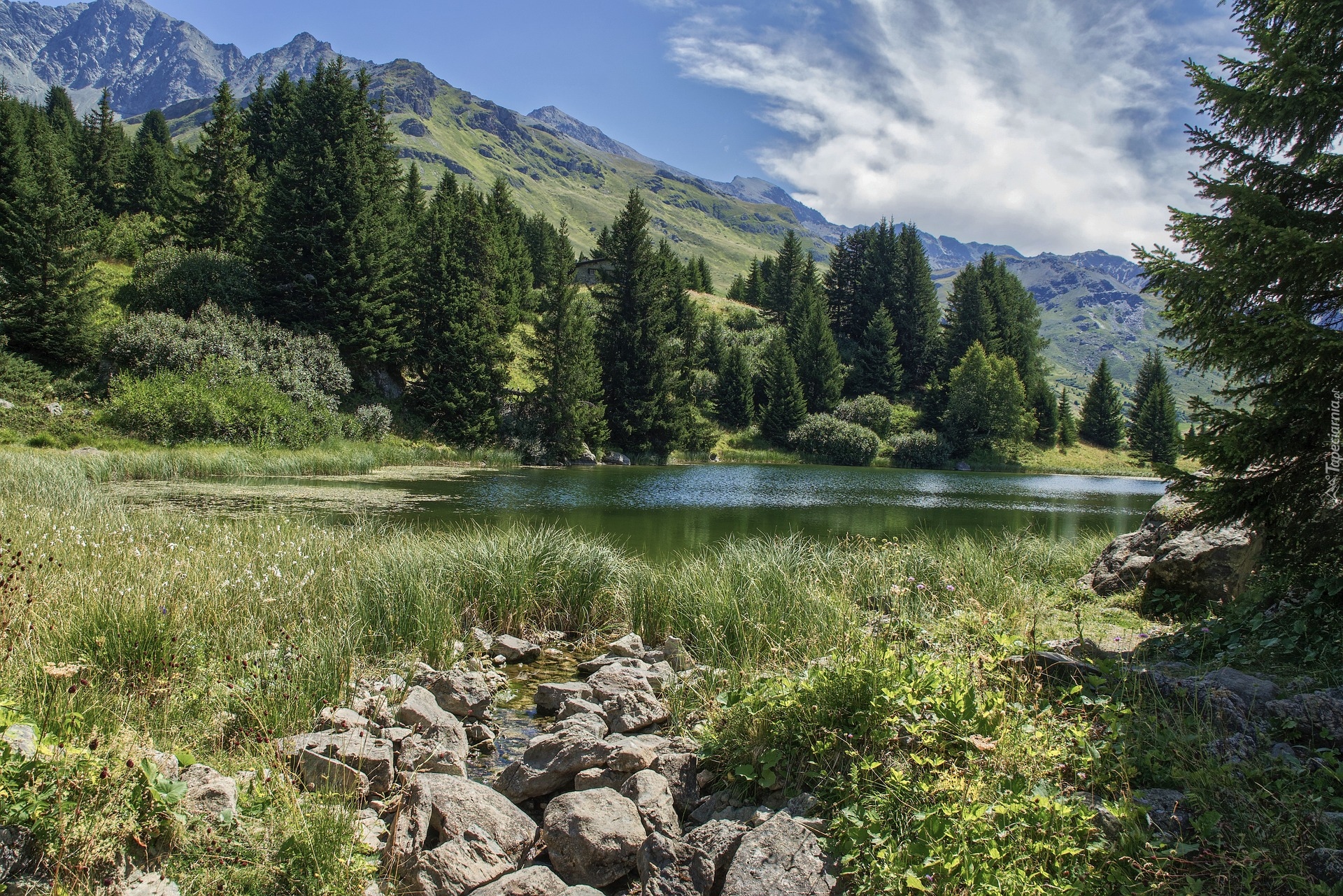 Edytor tapety: Drzewa i szuwary nad jeziorem w Alpach