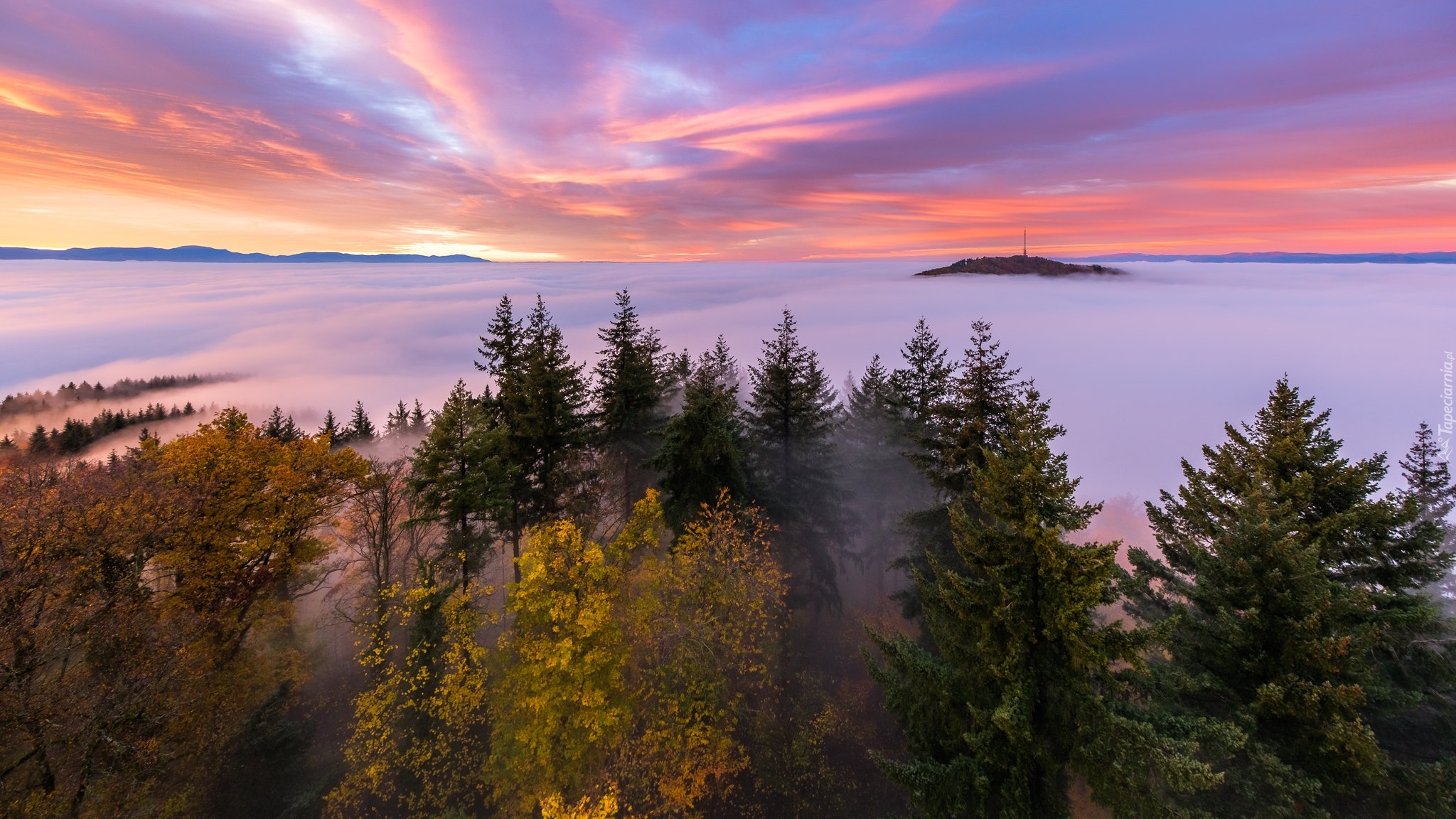 Edytor tapety: Jesienne krzewy i drzewa na tle gęstej mgły