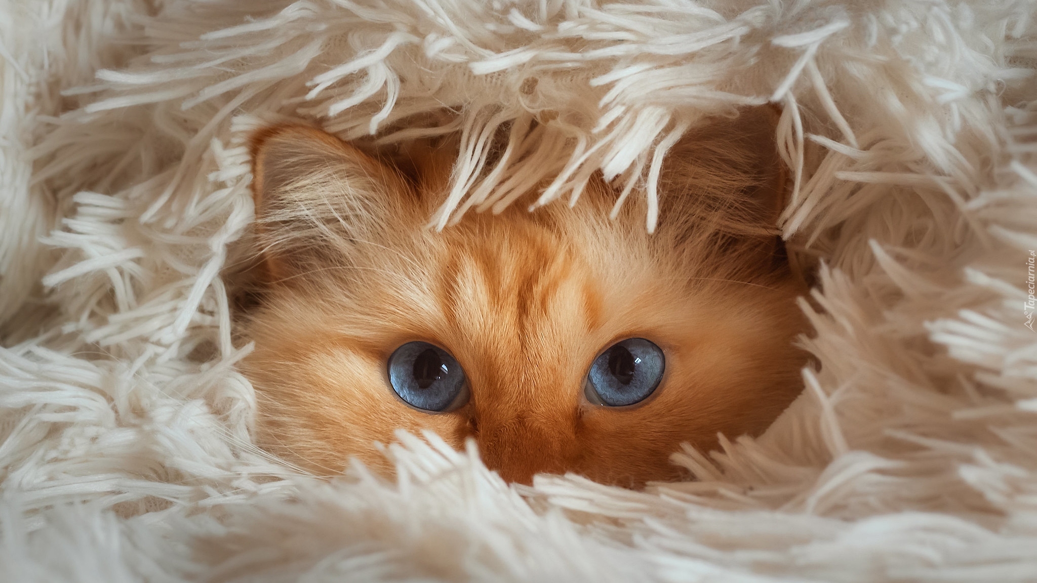 Edytor tapety: Głowa rudego kota spoglądającego spod koca
