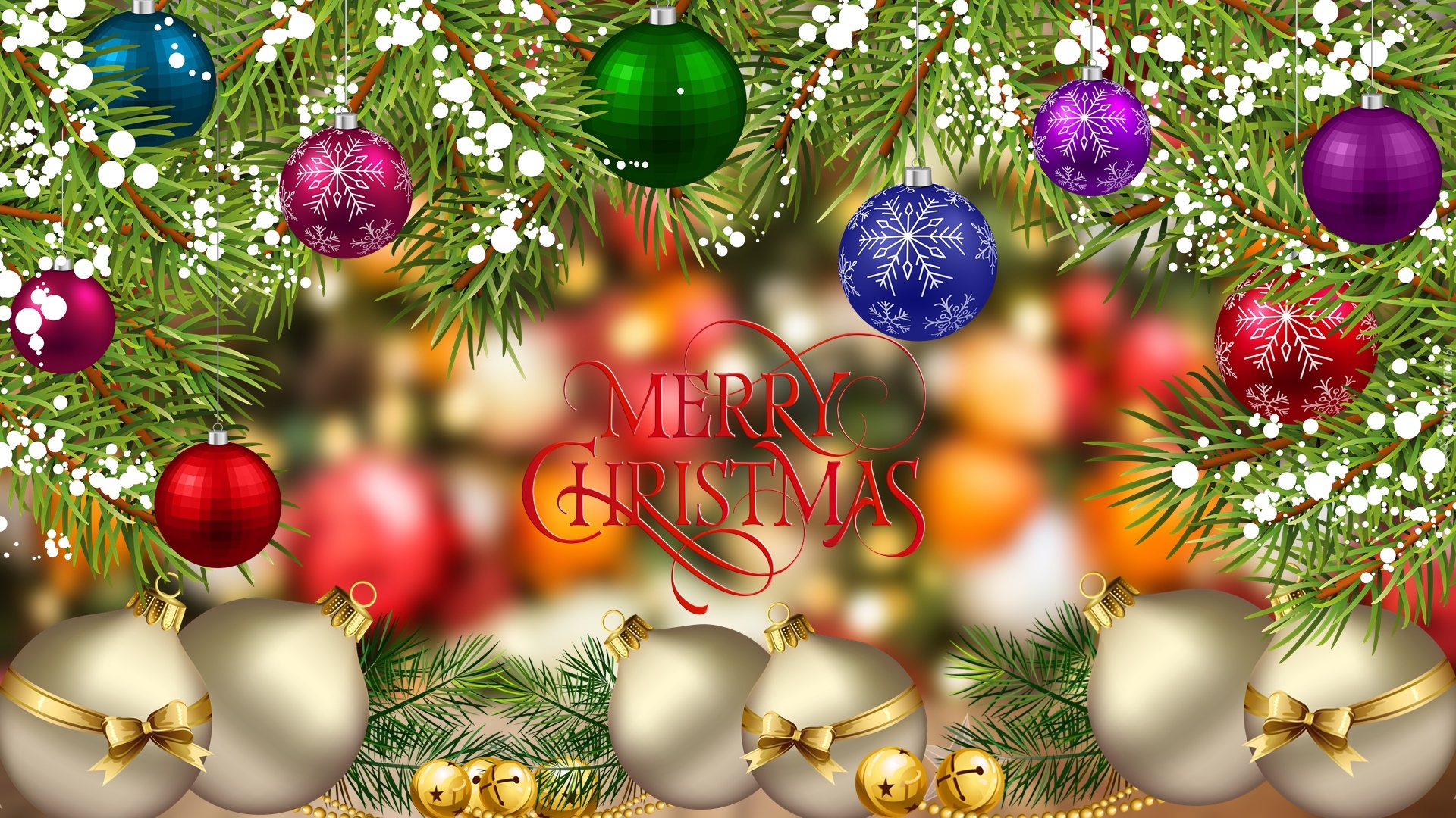 Edytor tapety: Napis Merry Christmas otoczony bombkami na gałązkach