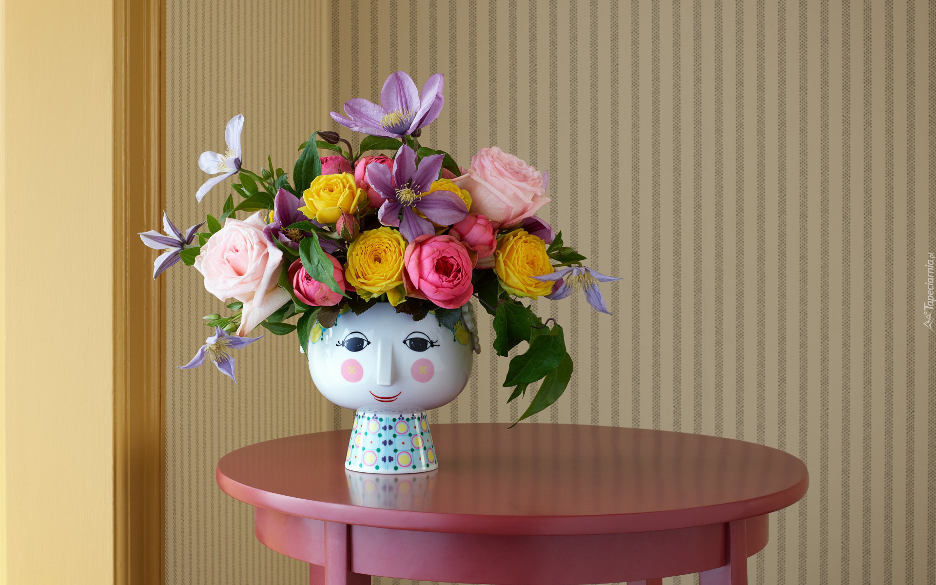 Edytor tapety: Kolorowe kwiaty w ozdobnym wazonie na stoliku