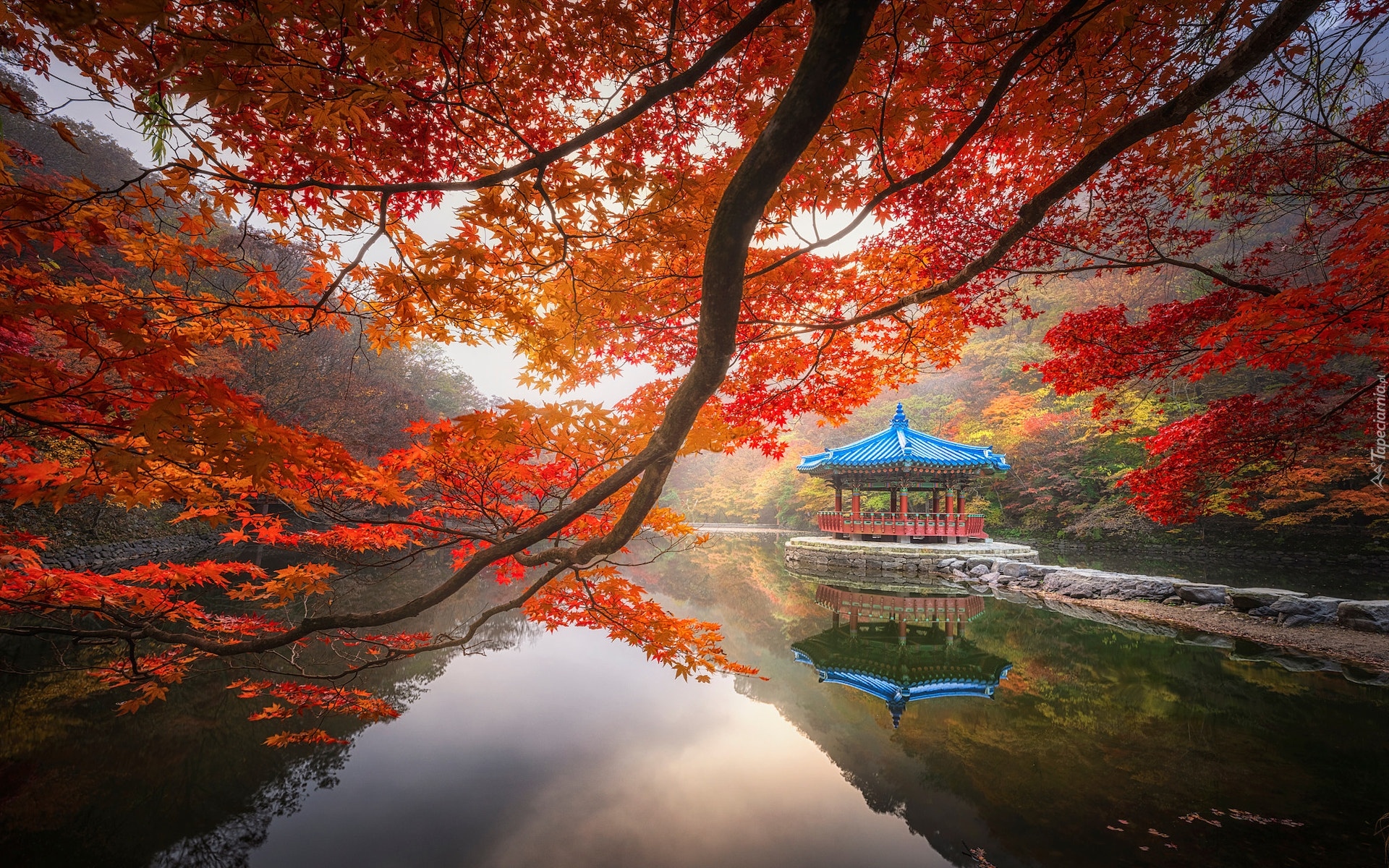 Edytor tapety: Pawilon Ukimido nad stawem Sagiike jesienią