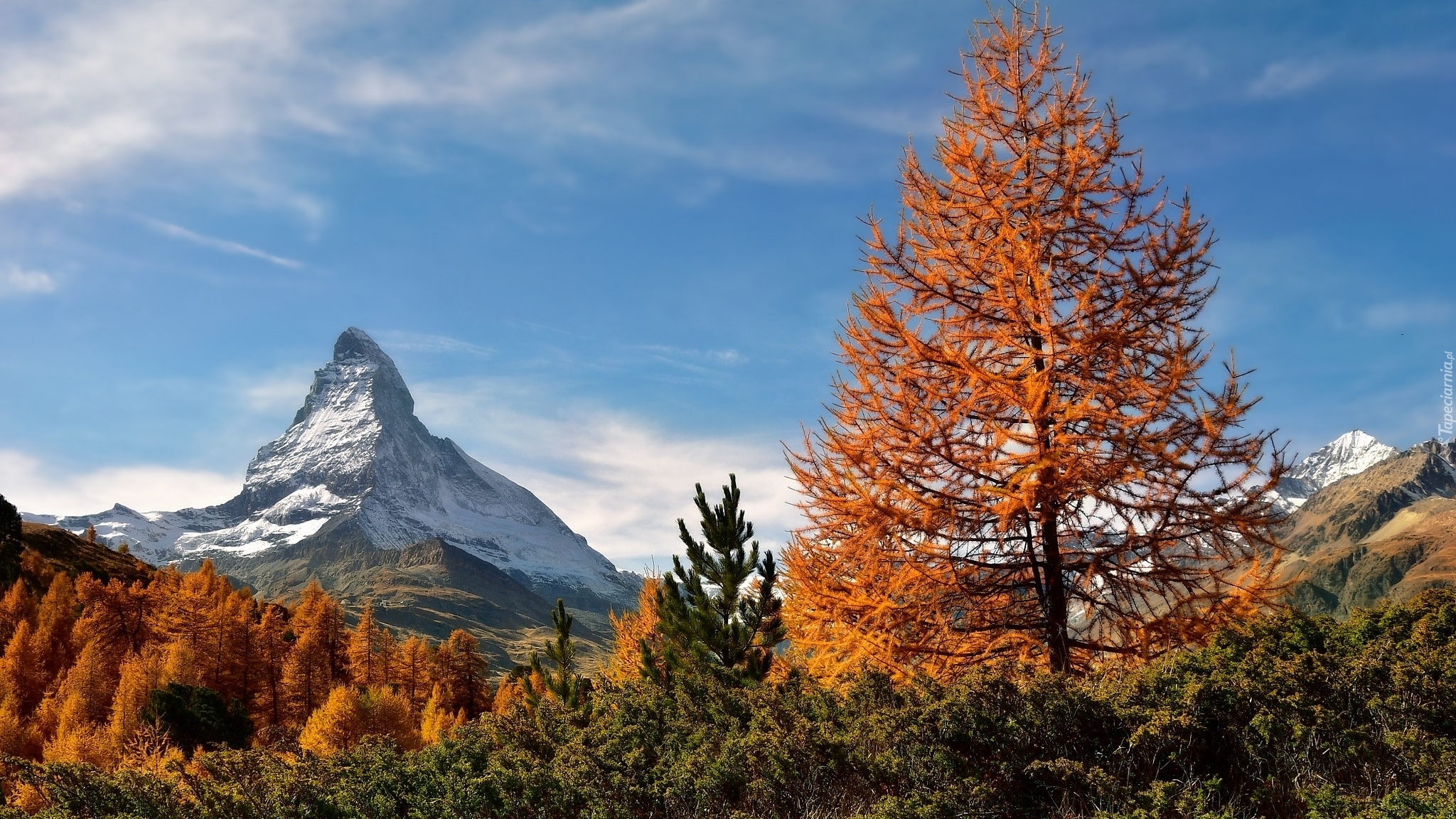 Edytor tapety: Pożółkłe modrzewie i szczyt Matterhorn w oddali