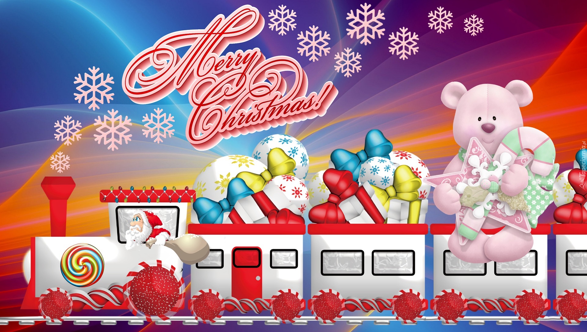Edytor tapety: Życzenia świąteczne nad pociągiem z zabawkami w grafice