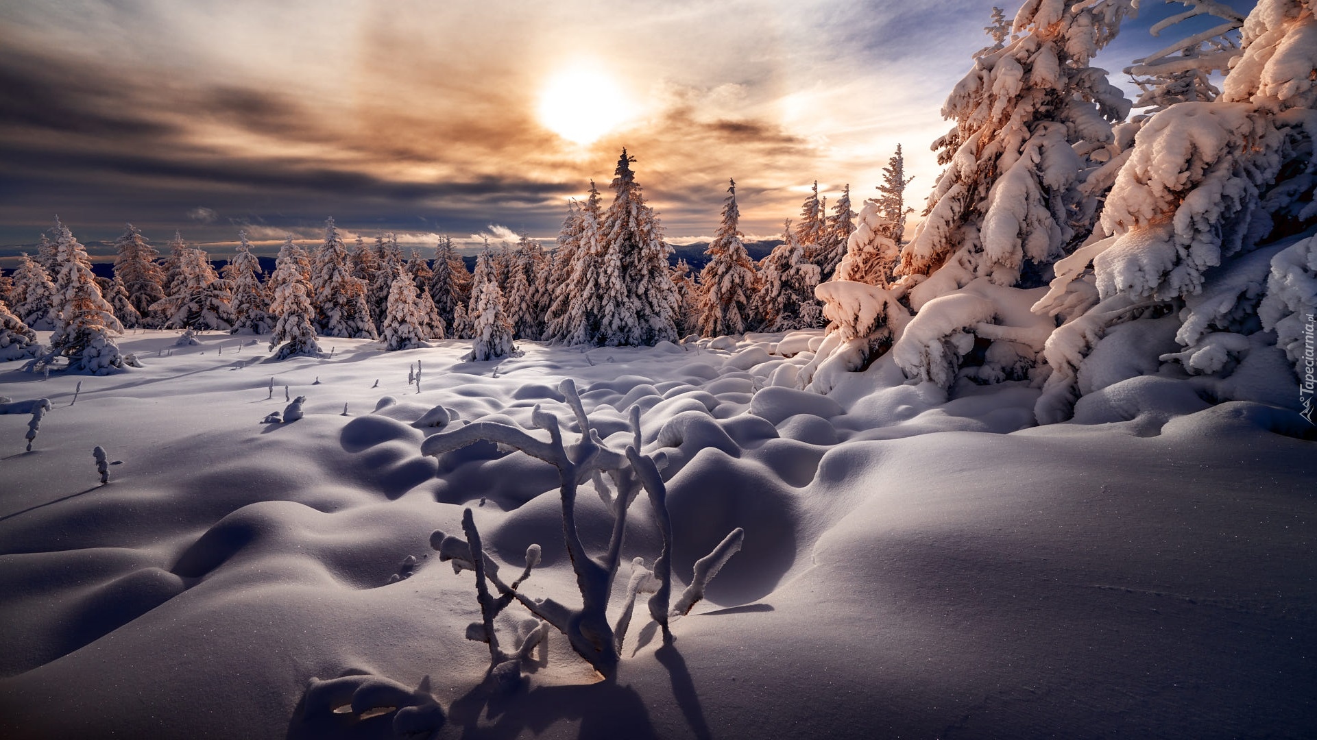 Edytor tapety: Ośnieżone drzewa w zaspach w słonecznym blasku