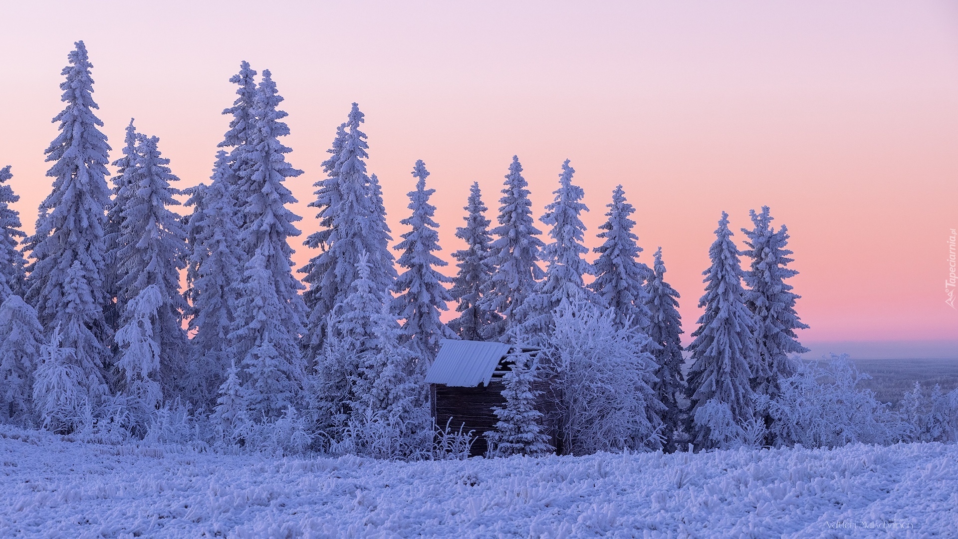 Edytor tapety: Szopa pod zasypanymi śniegiem drzewami na skraju łąki