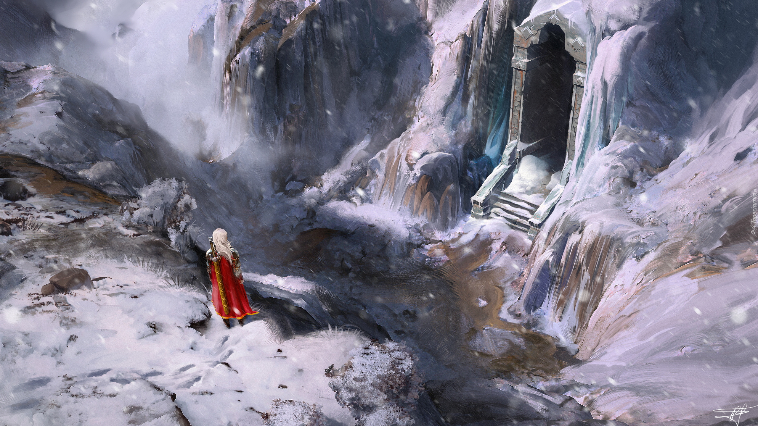 Edytor tapety: Postać na skraju urwiska i brama w skale