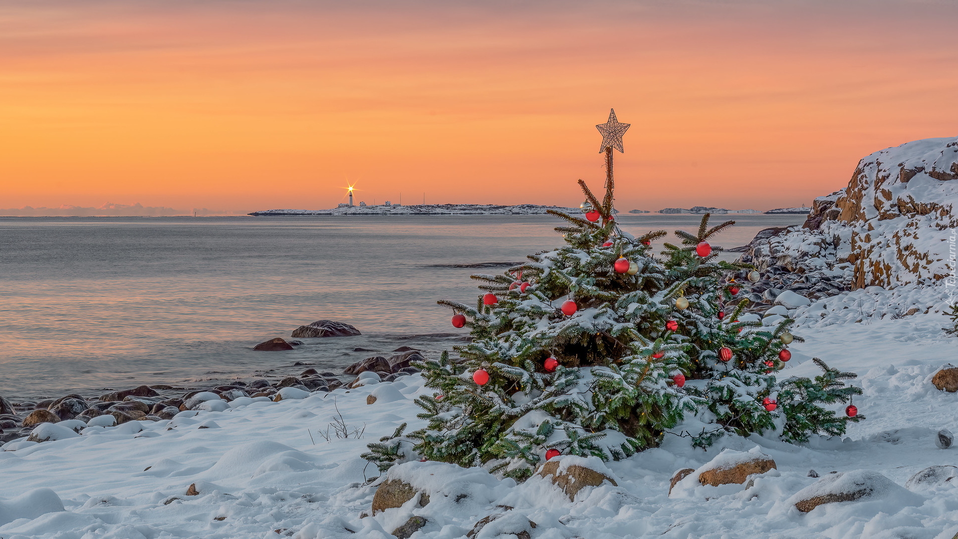 Edytor tapety: Udekorowana choinka nad morzem na wyspie Tromoy