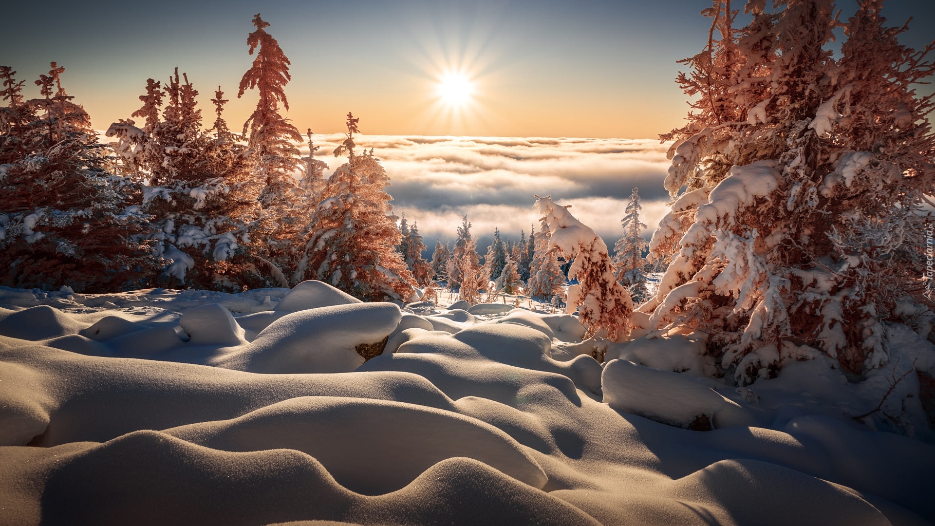 Edytor tapety: Rozświetlone promieniami słońca ośnieżone drzewa i mgła