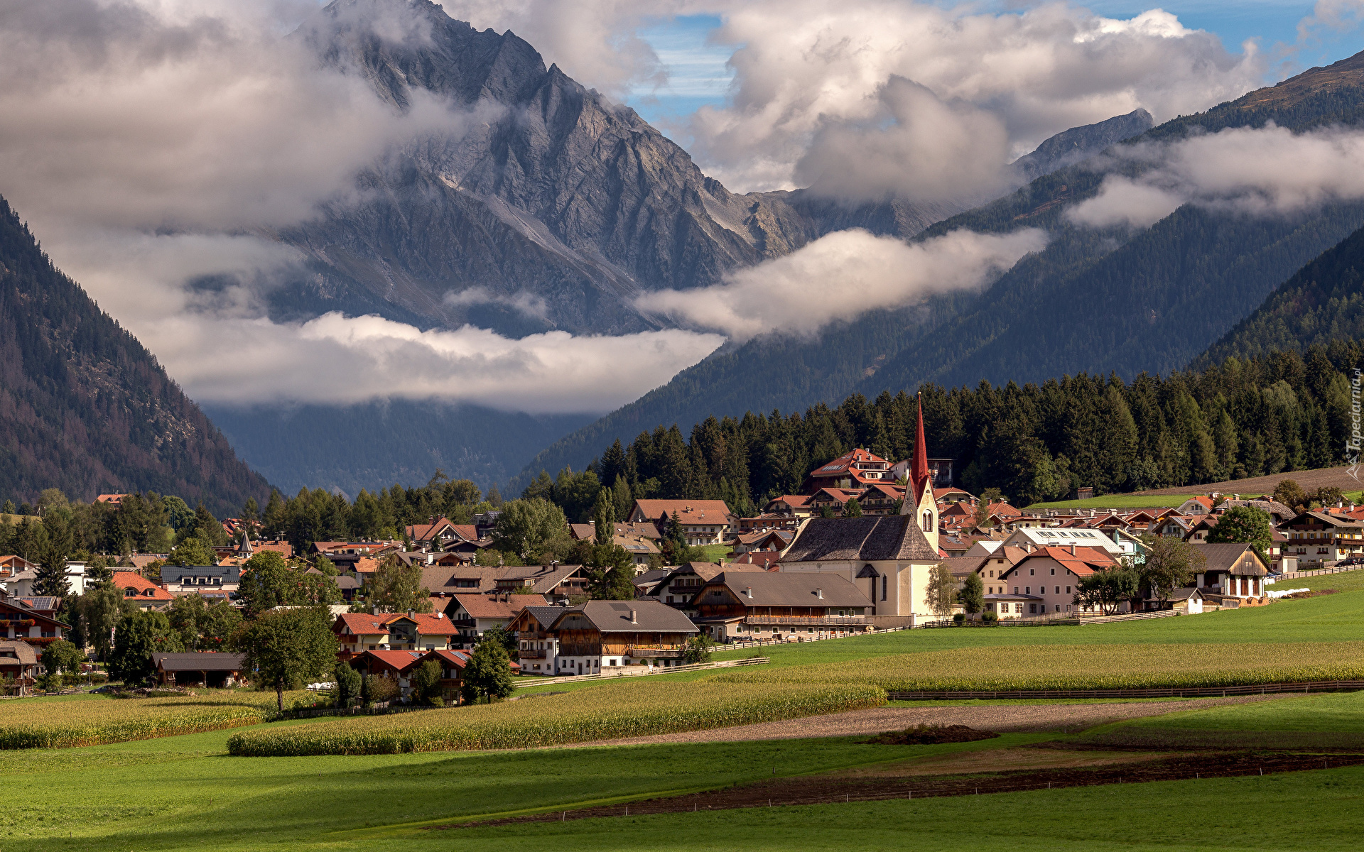 Edytor tapety: Miasteczko w dolinie na tle mgły nad Dolomitami