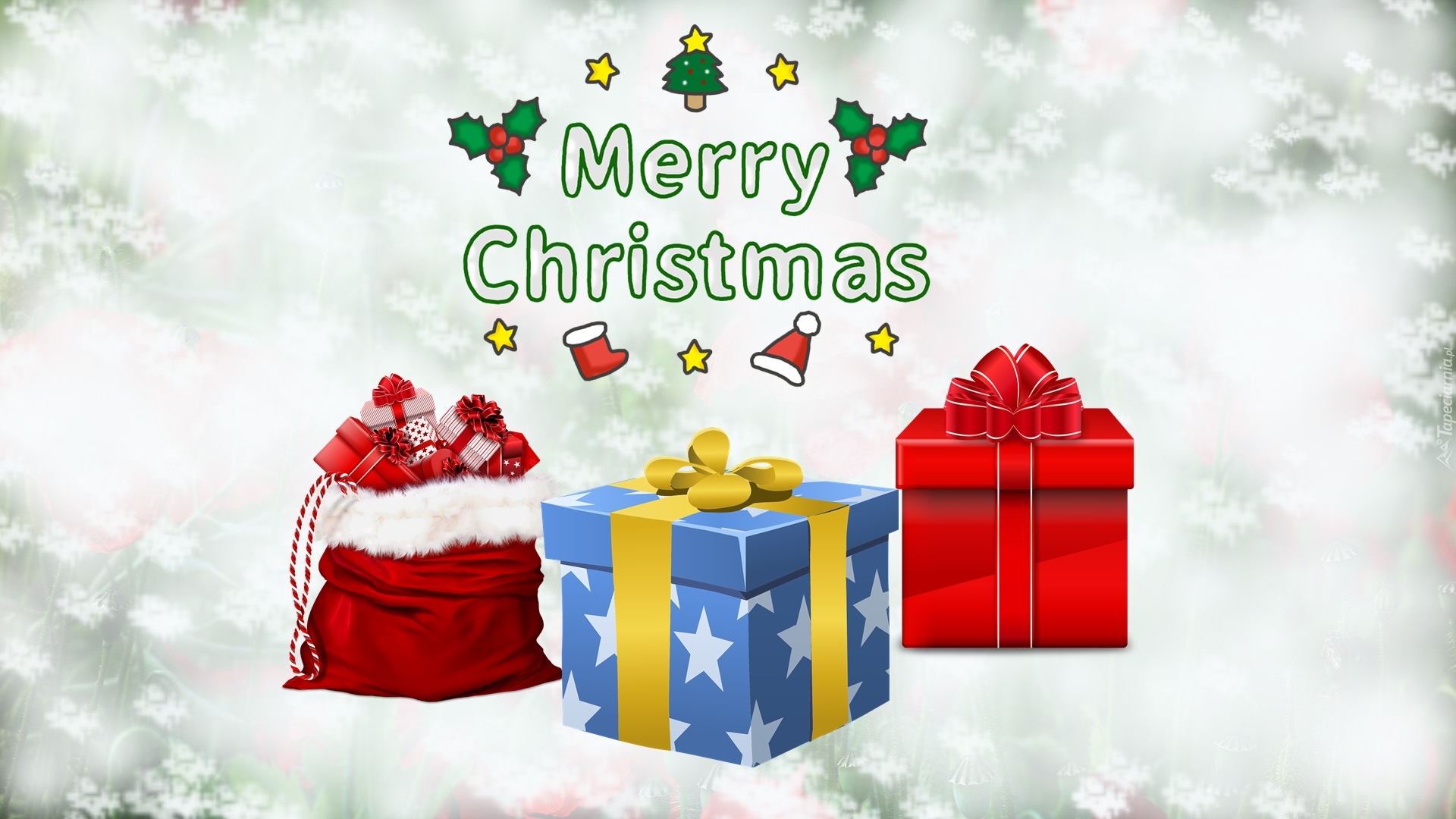 Edytor tapety: Napis Merry Christmas nad prezentami w grafice