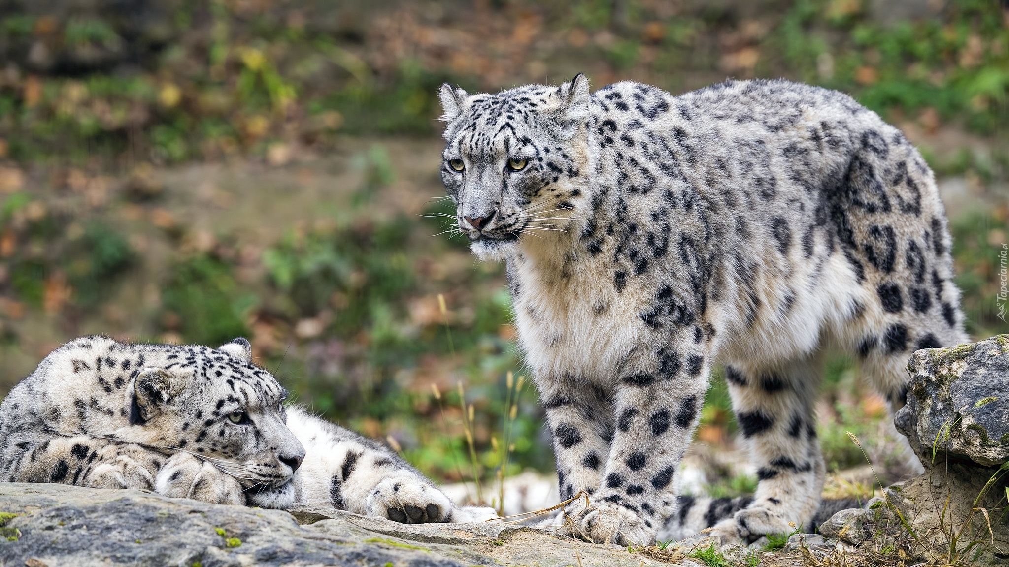 Edytor tapety: Dwa irbisy śnieżne na skałach