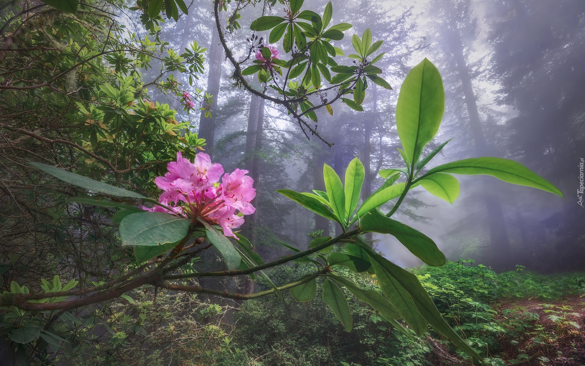 Edytor tapety: Kwitnący różanecznik w zamglonym Parku Narodowym Redwood