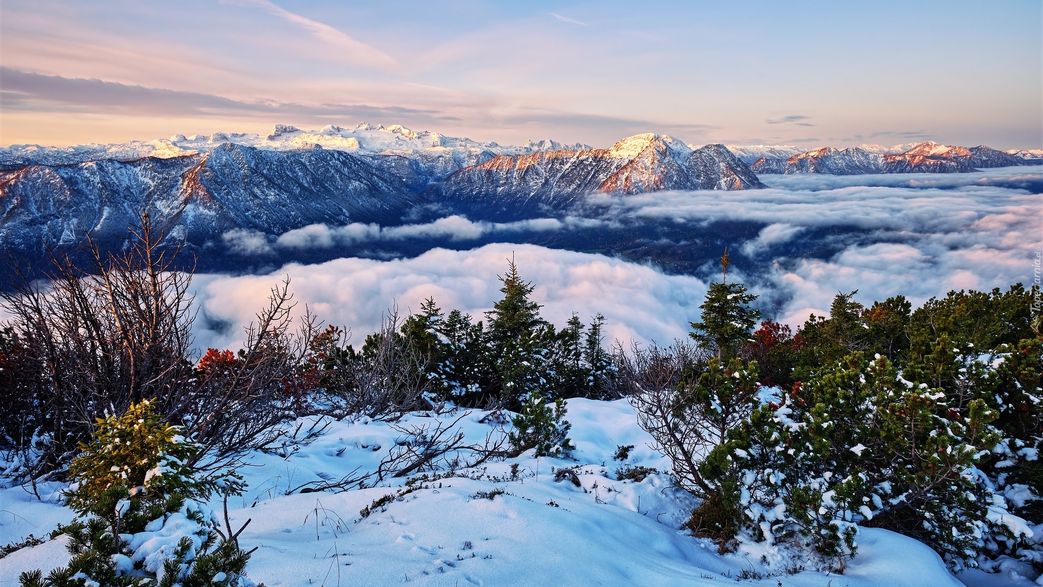Edytor tapety: Ośnieżone rośliny i góry w opadającej mgle
