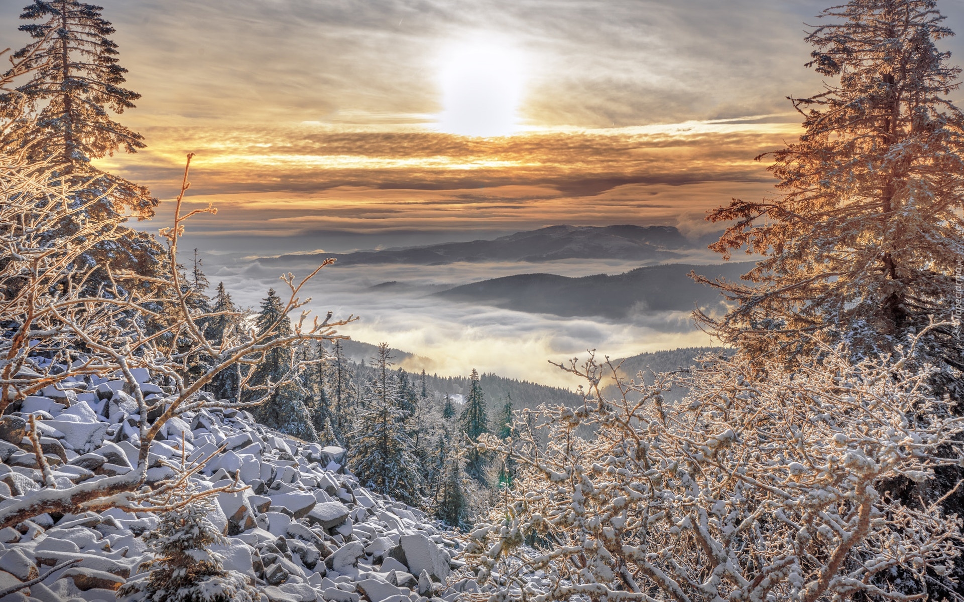 Edytor tapety: Ośnieżone rośliny i kamienie na tle zamglonych gór