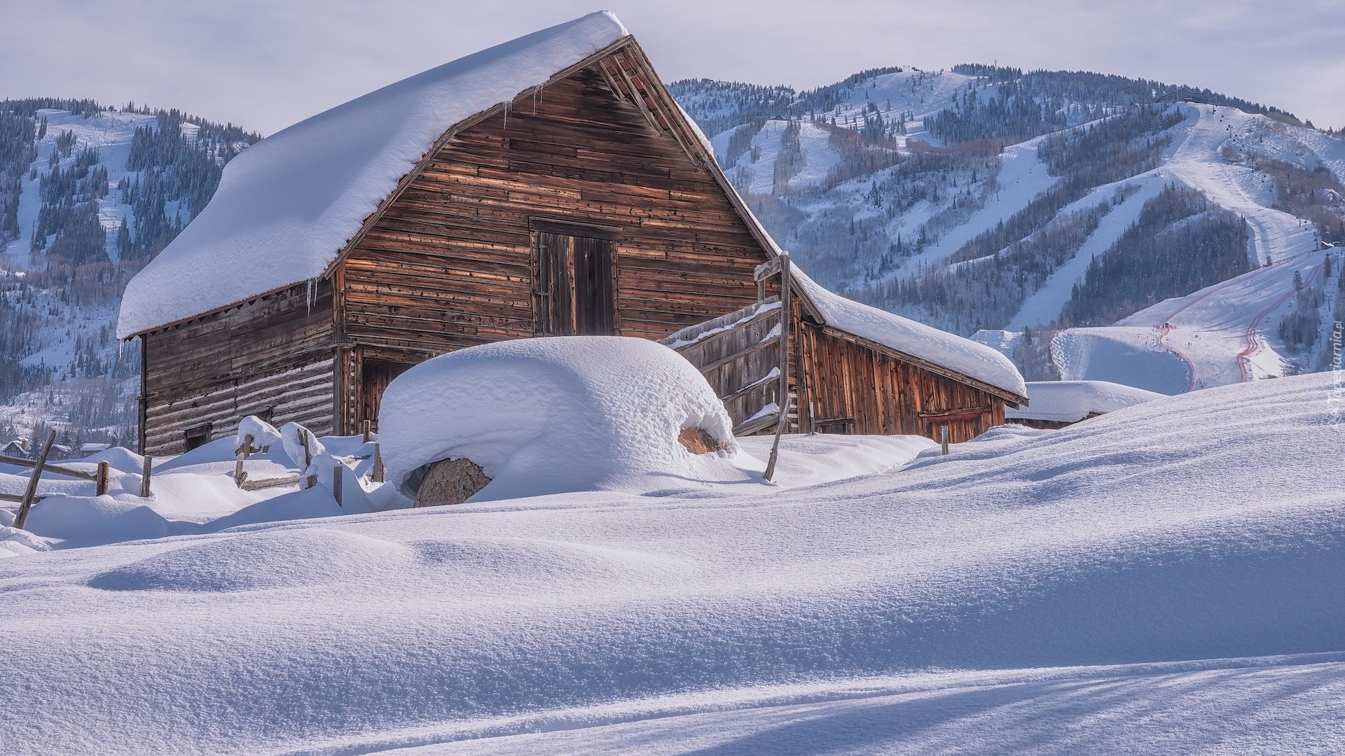 Edytor tapety: Szopa w zaspach na tle ośnieżonych gór