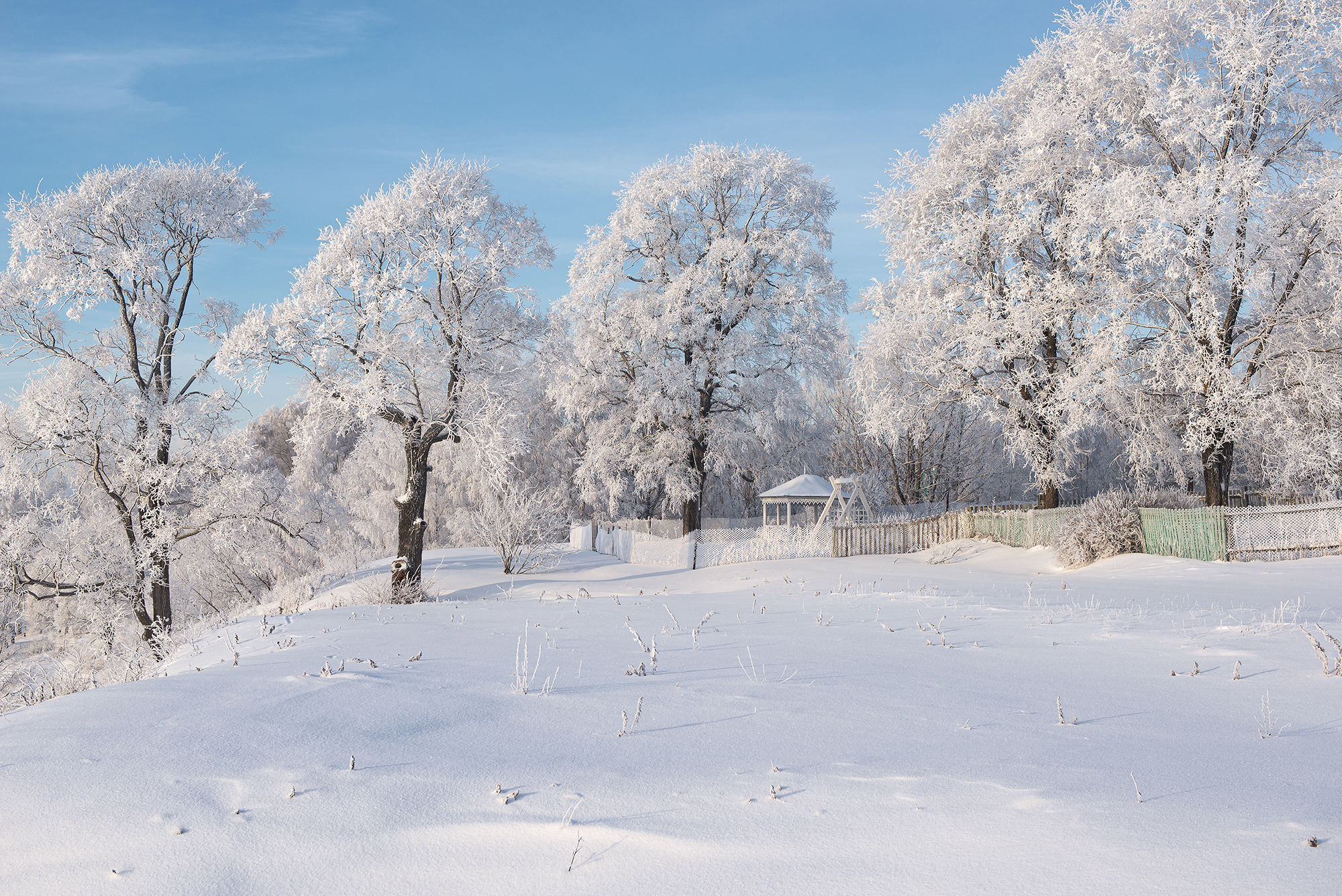 Edytor tapety: Altana pod ośnieżonymi drzewami w pogodny dzień