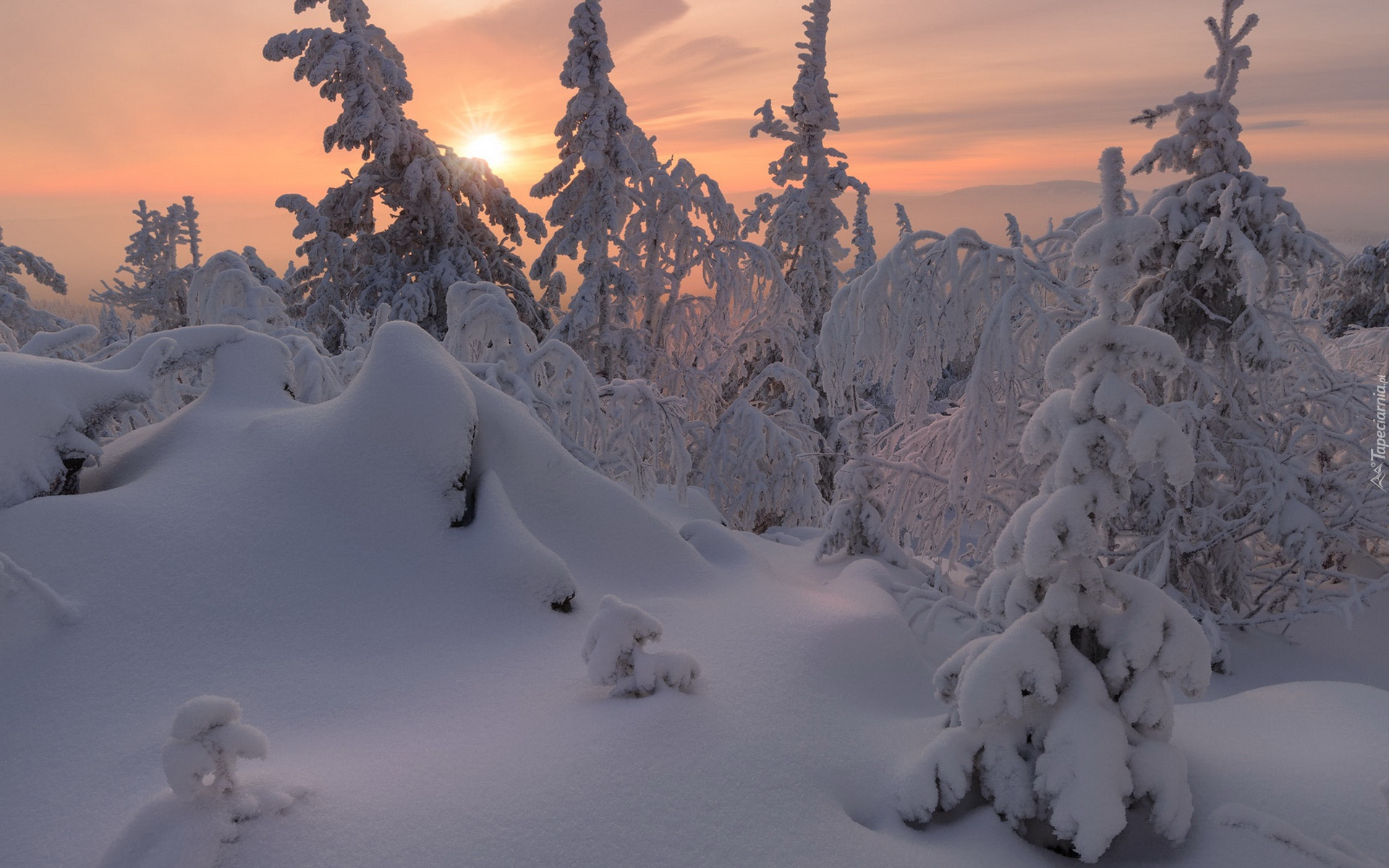 Edytor tapety: Drzewa zasypane śniegiem o zachodzie słońca