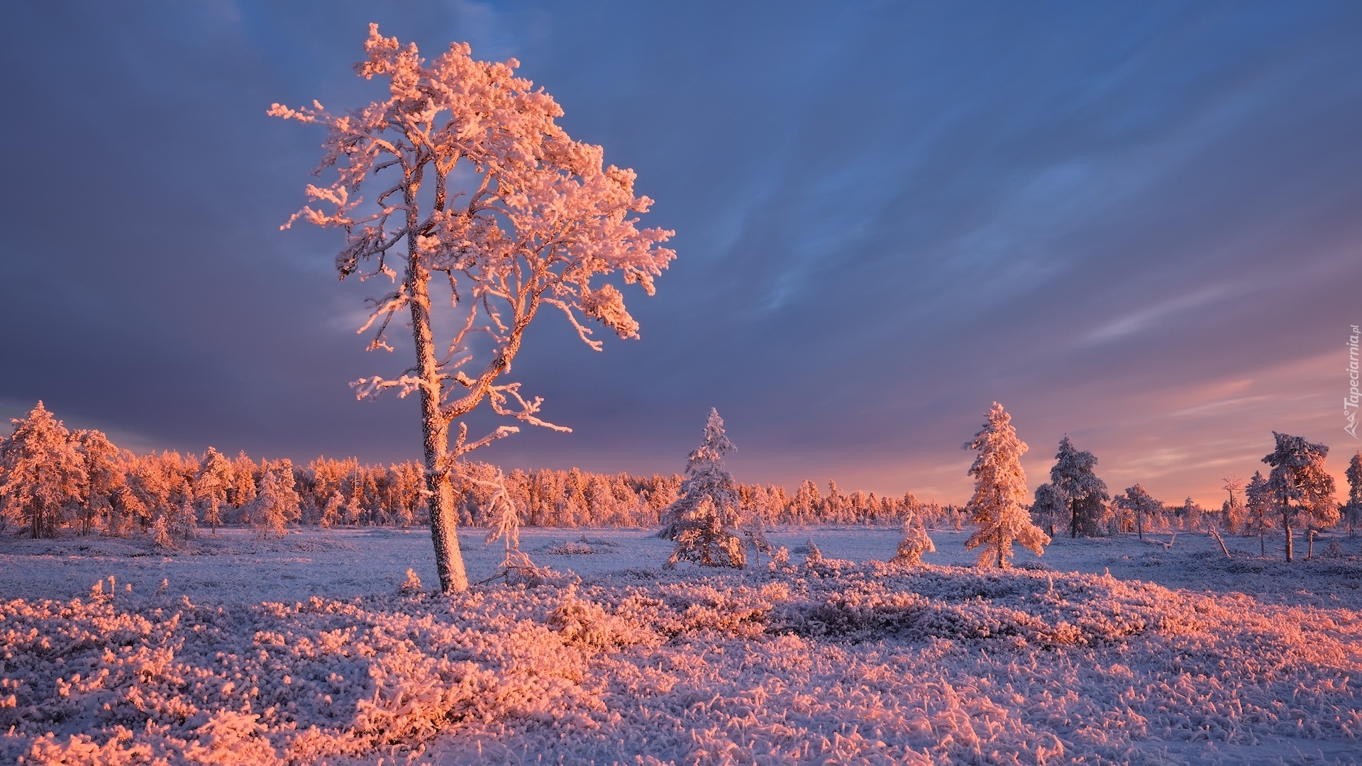 Edytor tapety: Rozświetlone słońcem oszronione drzewa i trawy