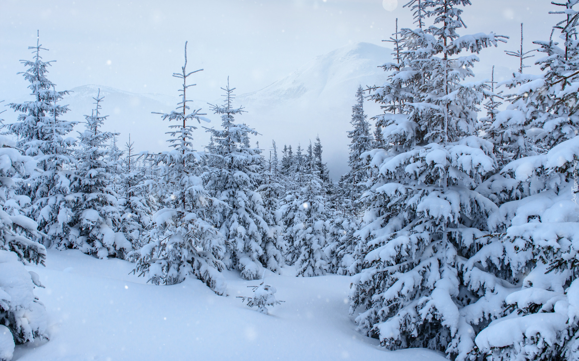 Edytor tapety: Świerki w zaspach i zamglone góry