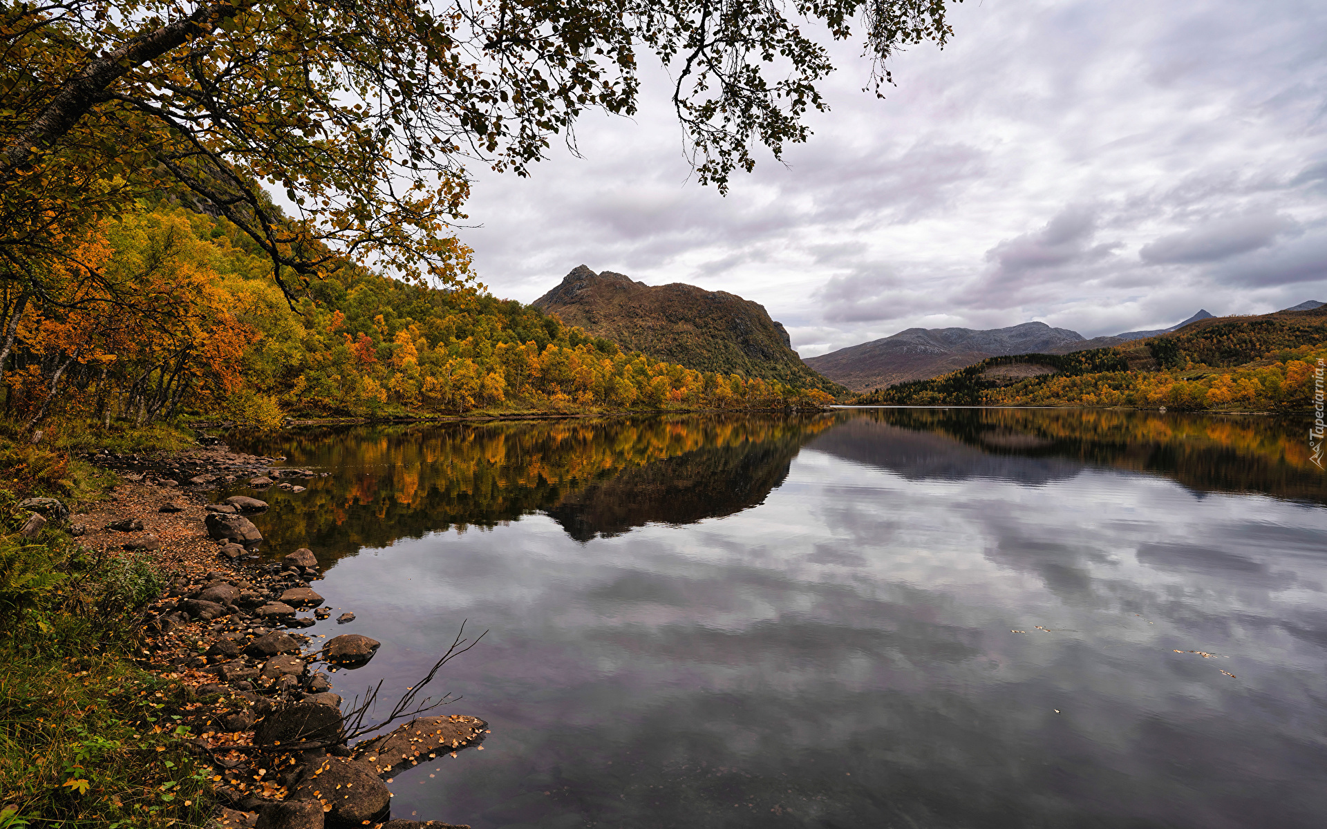 Edytor tapety: Jesienne drzewa na brzegu jeziora pod chmurami