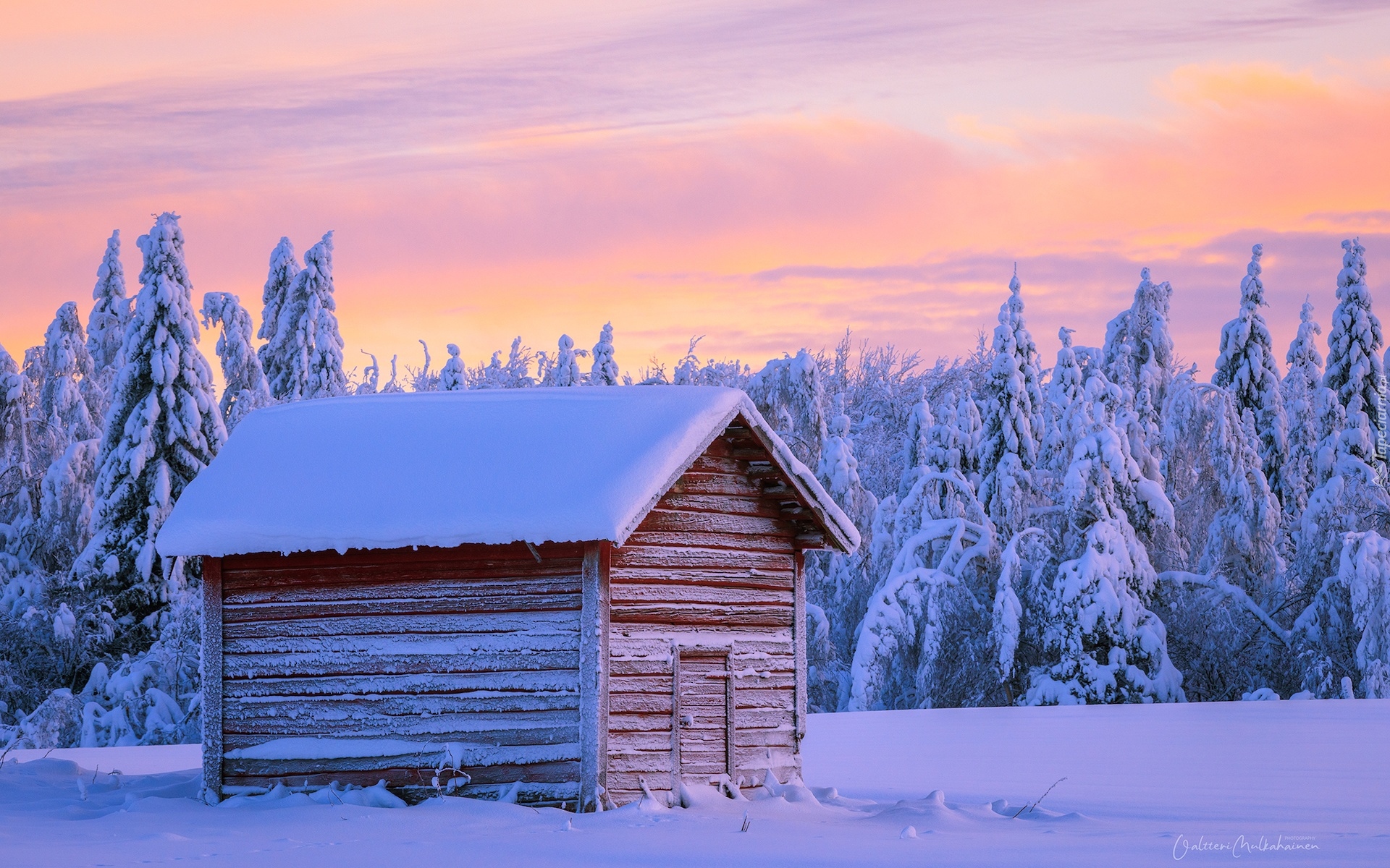 Edytor tapety: Drewniana szopa w śniegu na skraju ośnieżonego lasu